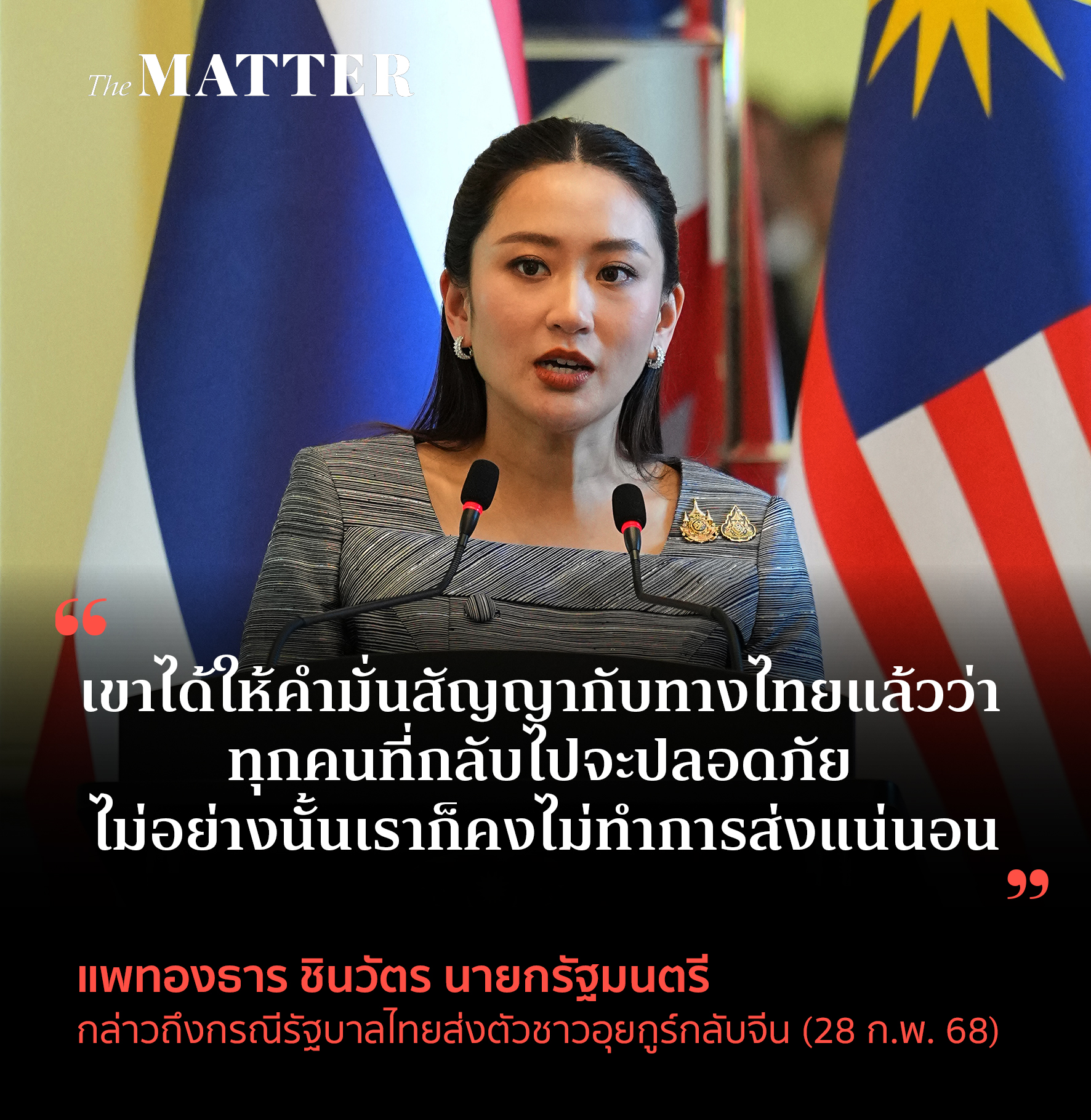 วันนี้ (28 กุมภาพันธ์ 2568) แพทองธาร ชินวัตร นายกรัฐมนตรี ได้ให้สัมภาษณ์เกี่ยวกับการส่งตัวชาวอุยกูร์ 40 คนกลับไปยังประเทศจีน โดยยืนยันว่าชาวอุยกูร์ที่ส่งตัว ได้กลับไปอย่างปลอดภัย และจะได้กลับไปอยู่กับครอบครัวและสังคม
