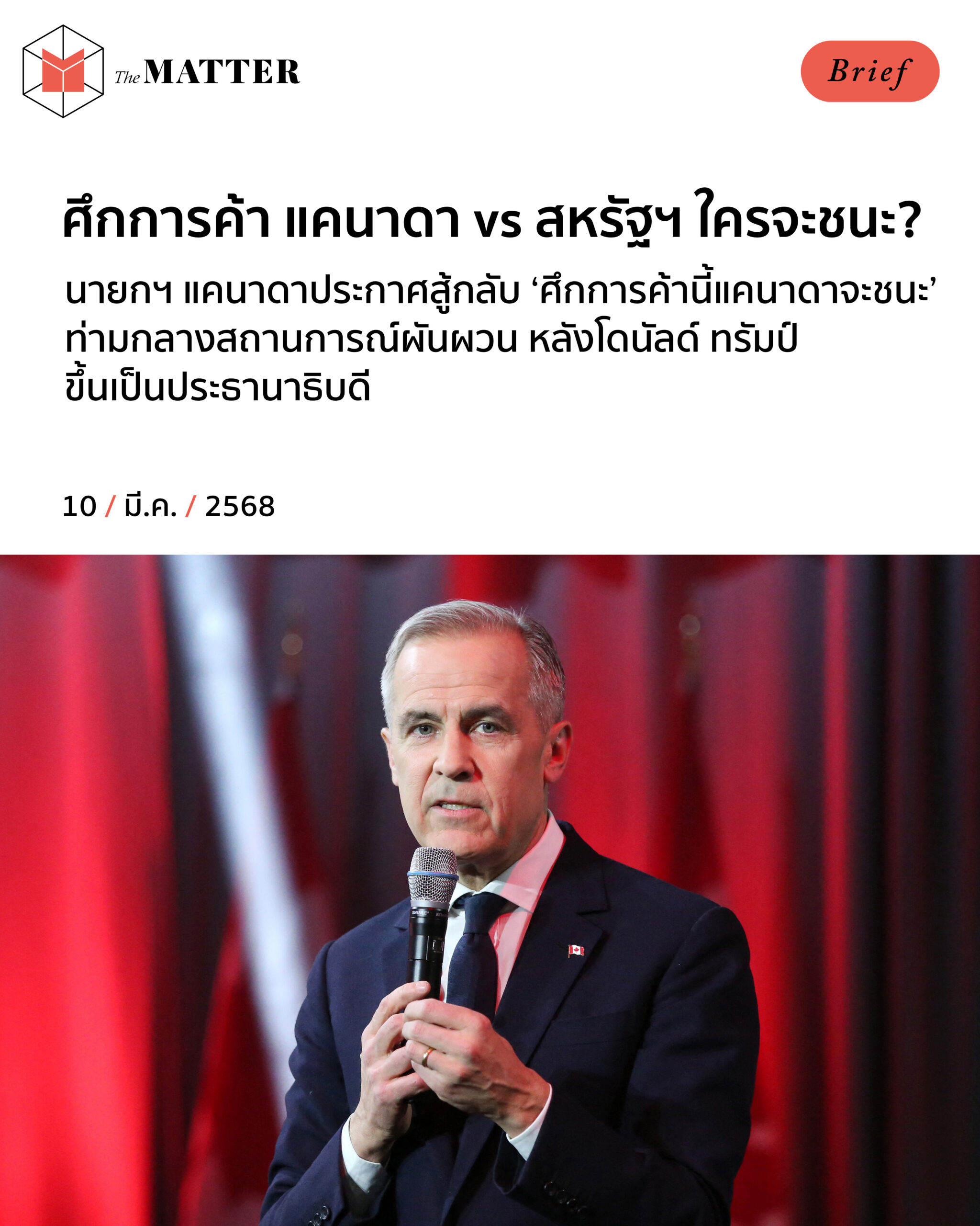 มาร์ก คาร์นีย์ (Mark Carney) อดีตผู้ว่าการธนาคารกลางแคนาดาและธนาคารแห่งอังกฤษ เป็นผู้ที่คว้าชัยชนะจากศึกการชิงตำแหน่งนายกรัฐมนตรีแคนาดา ต่อจาก จัสติน ทรูโด (Justin Trudeau) ได้ประกาศว่าพร้อมจะเอาชนะในสงครามการค้ากับ โดนัลด์ ทรัมป์ (Donald Trump) ประธานาธิบดีสหรัฐฯ ท่ามกลางความไม่แน่นอนที่เกิดขึ้นมากมาย