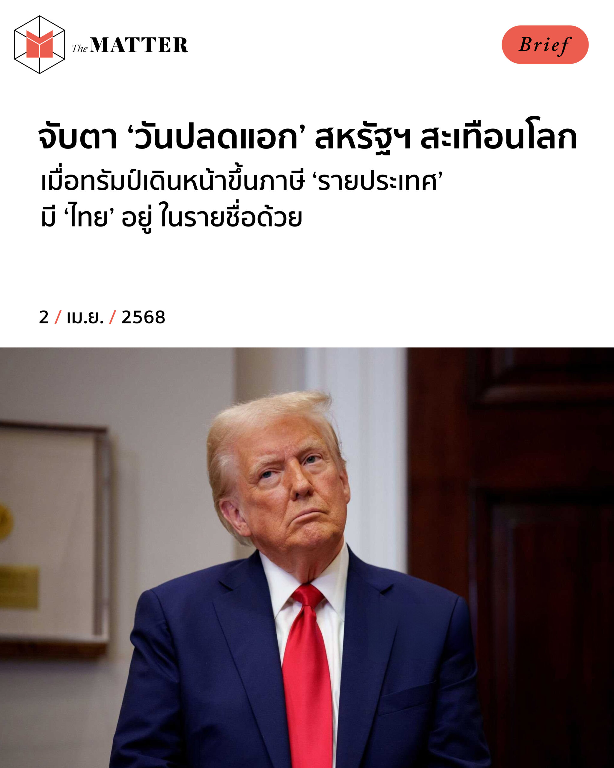 ล่าสุดที่ประเทศไทยเองเริ่มจะรู้สึกร้อนๆ หนาวๆ บ้างแล้ว หลังจากที่ทรัมป์ประกาศให้วันนี้ (2 เมษายน) เป็น ‘วันปลดแอก’ หรือ Liberation Day และจะทำการประกาศขึ้นภาษีเป็น ‘รายประเทศ’ ซึ่งหนึ่งในนั้นดันมีประเทศไทยด้วย