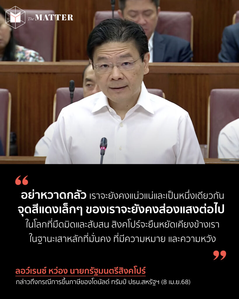 ลอว์เรนซ์ หว่อง นายกรัฐมนตรีสิงคโปร์ กล่าวในสภาถึงประเด็นการขึ้นภาษีของโดนัลด์ ทรัมป์ ประธานาธิบดีสหรัฐฯ ซึ่งสิงคโปร์จะจัดตั้งหน่วยงานพิเศษระดับชาติเพื่อสนับสนุนธุรกิจและแรงงานในการรับมือมาตรการดังกล่าว