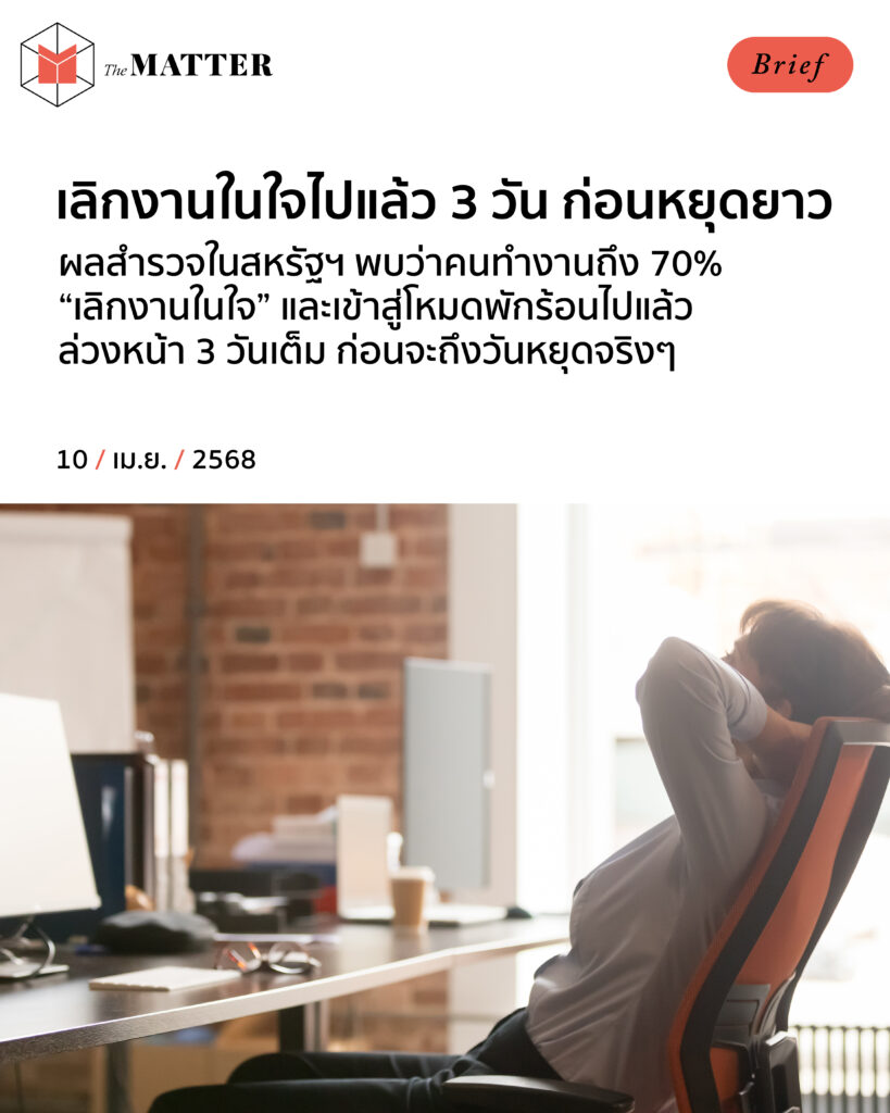 ใกล้วันหยุดยาวแล้ว เป็นเหมือนกันหรือเปล่า? ผลสำรวจในสหรัฐฯ พบว่าคนทำงานถึง 70% “เลิกงานในใจ” และเข้าสู่โหมดพักร้อนไปแล้ว ล่วงหน้า 3 วันเต็ม ก่อนจะถึงวันหยุดจริงๆ ซึ่งอาจอธิบายได้ว่า ทำไมเราจึงไม่ค่อยมีสมาธิทำงาน เมื่อใกล้ถึงเวลาพักร้อน