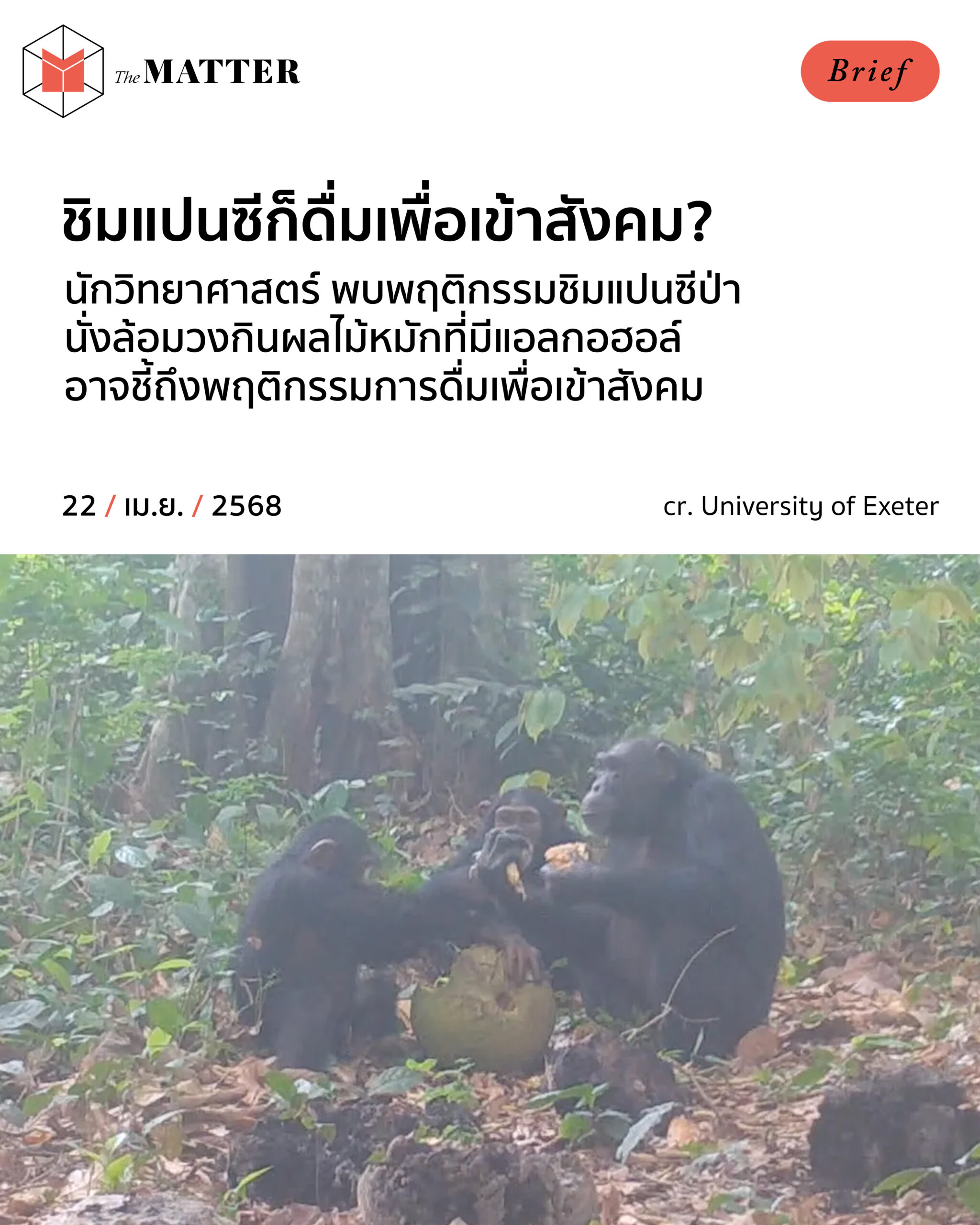 นักวิทยาศาสตร์ได้ติดตามชิมแปนซีป่า ในแอฟริกา แล้วพบพวกมันนั่งล้อมวงกินผลไม้หมักที่มีแอลกอฮอล์ อาจชี้ให้เห็นถึงพฤติกรรมการดื่มเพื่อเข้าสังคม ที่มีมาหลายล้านปีก่อนที่มนุษย์จะเริ่มผลิตเบียร์