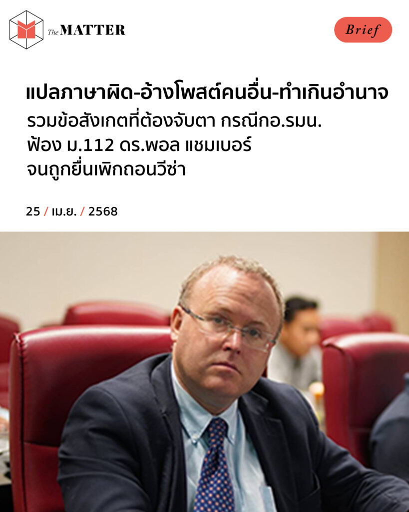 เมื่อวานนี้ (24 เมษายน 2568) ในที่ประชุมคณะกรรมาธิการการทหาร วาระพิจารณาศึกษาเรื่อง ดร.พอล แชมเบอร์ อาจารย์จากมหาวิทยาลัยเนรศวร ถูกกองทัพภาค 3 แจ้งความดำเนินคดีข้อหาความผิด ม. 112 โดยมี วิโรจน์ ลักขณาอดิศร สส.พรรคประชาชน เป็นประธานการประชุม โดยมีตัวแทนของ กอ.รมน.ภาค 3 ชี้แจงด้วย