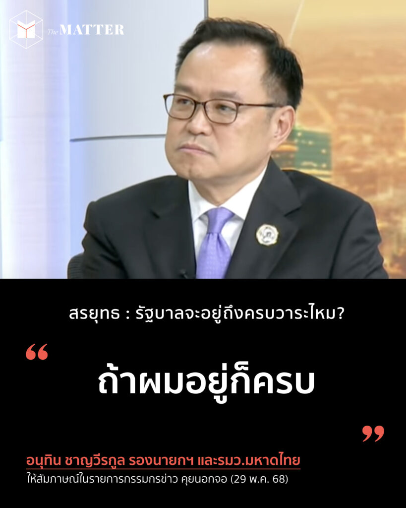 หัวหน้าพรรคภูมิใจไทยยังได้ยืนยันถึงความสัมพันธ์ที่ดีกับอดีตนายกฯ ทักษิณ ชินวัตร รวมถึงนายกฯ แพทองธาร ชินวัตร โดยในช่วงท้ายของรายการสรยุทธ์ถามอนุทินว่า รัฐบาลนี้จะเป็นรัฐบาลจากการเลือกตั้งที่อยู่ครบวาระหรือไม่ ซึ่งอนุทินตอบว่า “ถ้าผมอยู่ก็ครบ” สรยุทธ์ถามต่อว่า หากเขาเอาไม่อยู่ล่ะ อนุทินตอบกลับว่า “มันก็คงไม่ราบรื่น”