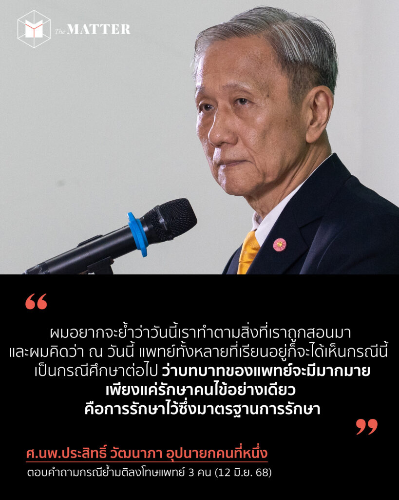 โดย ศ.นพ.ประสิทธิ์ กล่าวว่า “ไม่ว่าจะเป็นแพทย์รุ่นใหม่หรือแพทย์รุ่นเดิม เราได้รับการอบรมสั่งสอนมาเหมือนกัน เราเข้าใจจรรยาบรรณแห่งวิชาชีพ เราเข้าใจความถูกต้อง เราเข้าใจบทบาท และหน้าที่เหมือนกัน ผมอยากจะย้ำว่าวันนี้เราทำตามสิ่งที่เราถูกสอนมา และผมคิดว่า ณ วันนี้ แพทย์ทั้งหลายที่เรียนอยู่ก็จะได้เห็นกรณีนี้ เป็นกรณีศึกษาต่อไป ว่าบทบาทของแพทย์จะมีมากมายเพียงแค่รักษาคนไข้อย่างเดียว คือการรักษาไว้ซึ่งมาตรฐานการรักษา” ศ.นพ.ประสิทธิ์ กล่าวก่อนจะเดินออกจากวงสัมภาษณ์ไป