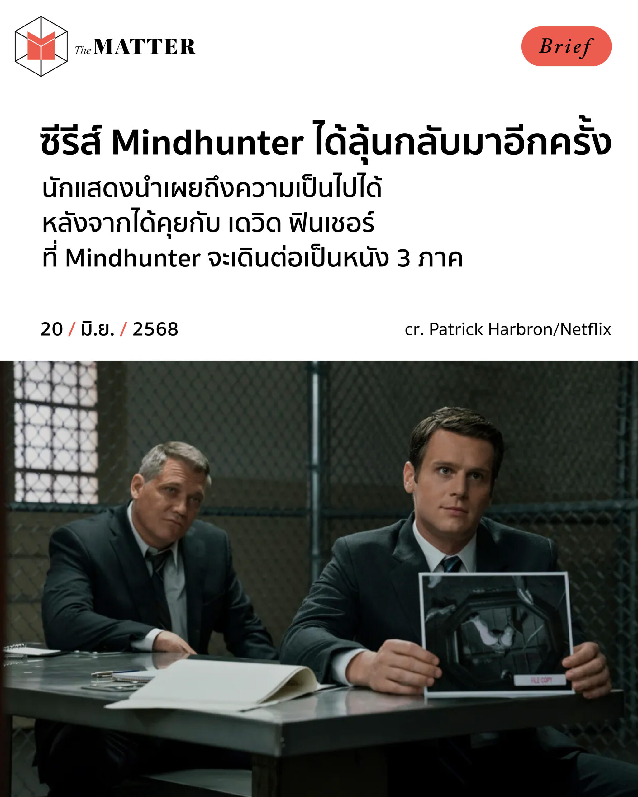 ไม่นานมานี้ นักแสดงนำจากซีรีส์ Mindhunter เผยถึงความเป็นไปได้ที่ซีรีส์จะกลับมาอีกครั้ง หลังจากที่รอคอยกันมา 6 ปี โดยอาจอยู่ในรูปแบบภาพยนตร์ 3 ภาค