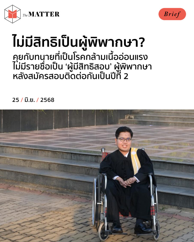 ผู้ที่มีข้อจำกัดทางร่างกาย เช่น กล้ามเนื้ออ่อนแรง นั่งวีลแชร์ หรืออื่นๆ จะมีสิทธิเป็นผู้พิพากษาได้จริงหรือไม่ เมื่อยังถูกผู้จัดสอบมองว่า “การขอคนช่วยเขียนคำตอบเป็นการเอาเปรียบ” และแม้จะขอเขียนคำตอบเอง ก็ยัง ‘ถูกตัดสิทธิ์สอบ’ อยู่ดี ?