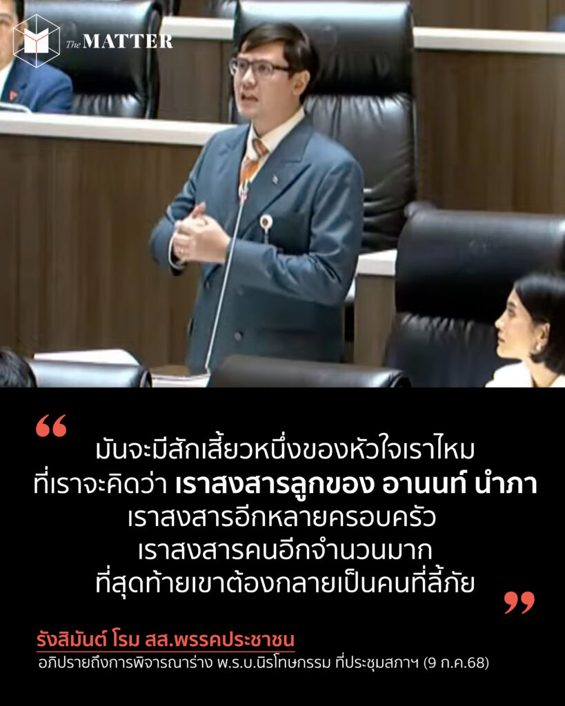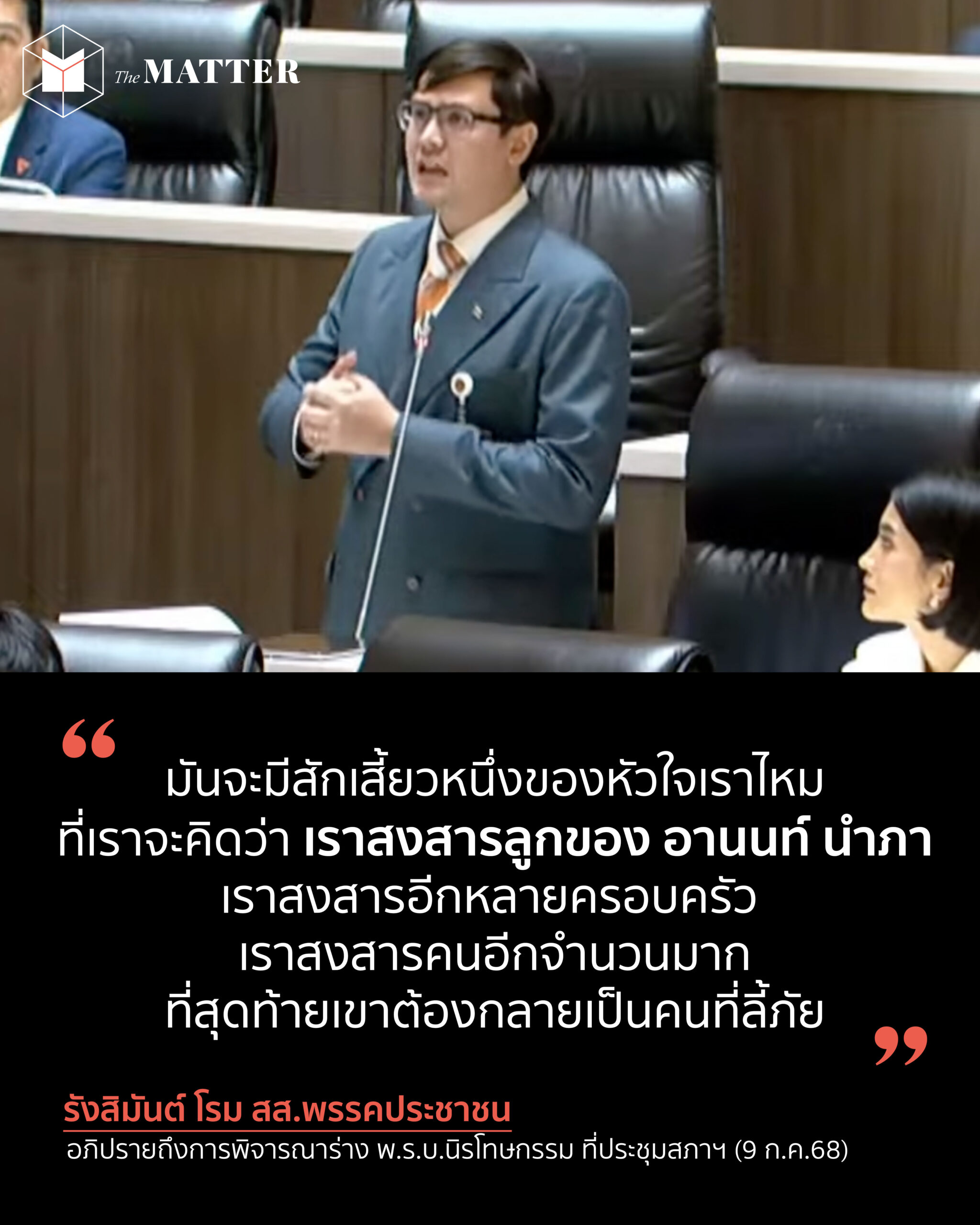 การอภิปรายของ รังสิมันต์ โรม สส.พรรคประชาชน เกี่ยวกับการพิจารณาร่าง พ.ร.บ.นิรโทษกรรม ที่ประชุมสภาฯ เขากล่าวว่า ถ้าวันนี้ ผมอยู่ในสภานิติบัญญัติแห่งชาติที่มาจากการแต่งตั้งของคณะรัฐประหาร ผมจะไม่แปลกใจเลย ที่เราจะได้เห็นผู้มีอำนาจที่บ้าอำนาจ และใช้อำนาจในการรังแกคนที่เห็นต่างทางการเมือง