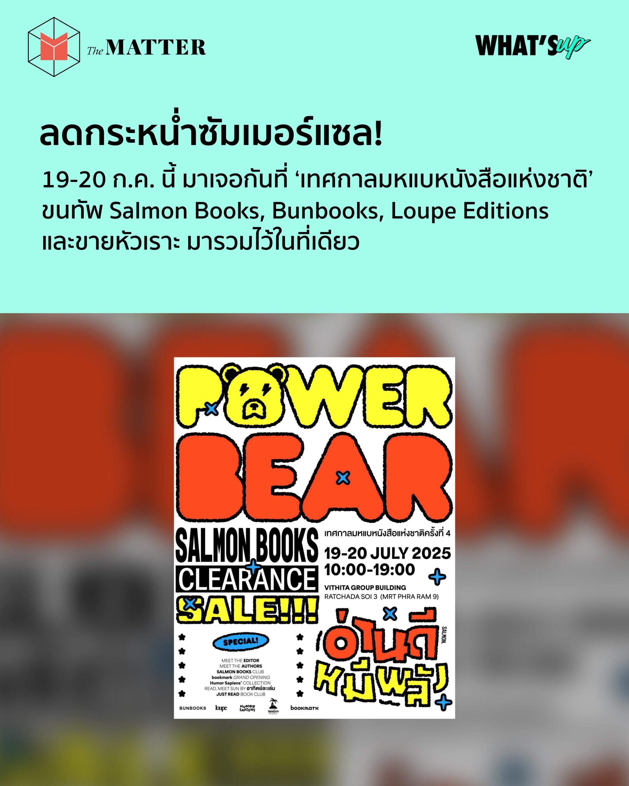 ‘เทศกาลมหแบหนังสือแห่งชาติ’ งานลดกระหน่ำซัมเมอร์แซล (เซล!) หรืองานเคลียร์แรนซ์ในรอบ 3 ปีของ Salmon Books / Bunbooks / Loupe Editions / ขายหัวเราะ ที่จะขนหนังสือทุกปกที่มีอยู่มาแบขายในราคาพิเศษสุดๆ ไม่จะเป็นเล่มฮอตฮิตเบสต์เซลเลอร์ เล่มแรร์ไอเทมในตำนาน หรือเล่มที่หลายคนหาตามร้านไม่เจอแล้ว แค่มาเดินงานนี้ ก็อาจจะเจอกับเล่มที่ตามหาก็ได้
