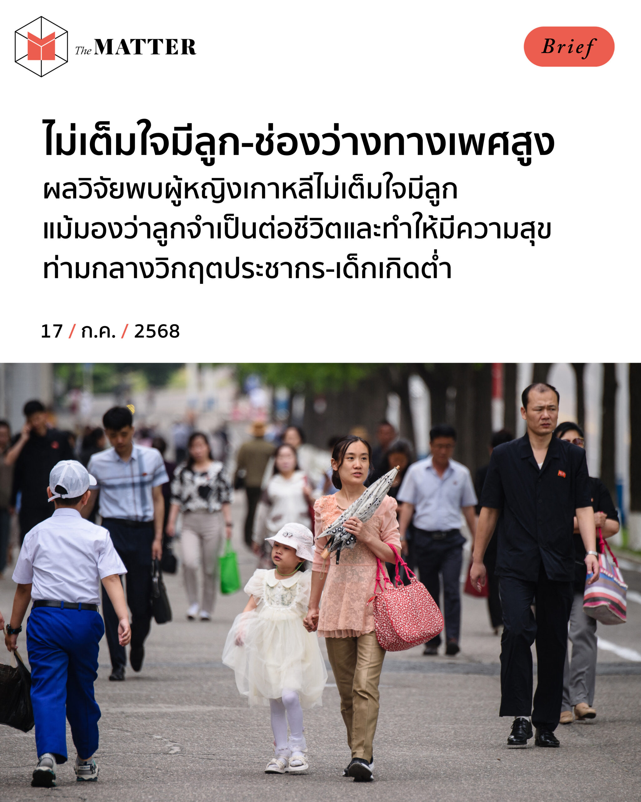 งานวัยจัยชิ้นหนึ่งระบุว่า ผู้หญิงเกาหลีมีแนวโน้มจะมีลูกต่ำที่สุดในบรรดาประเทศใหญ่ๆ ซึ่งตอกย้ำถึงวิกฤตประชากรที่กำลังเลวร้ายลงของเกาหลีใต้ และช่องว่างทางเพศที่สูง