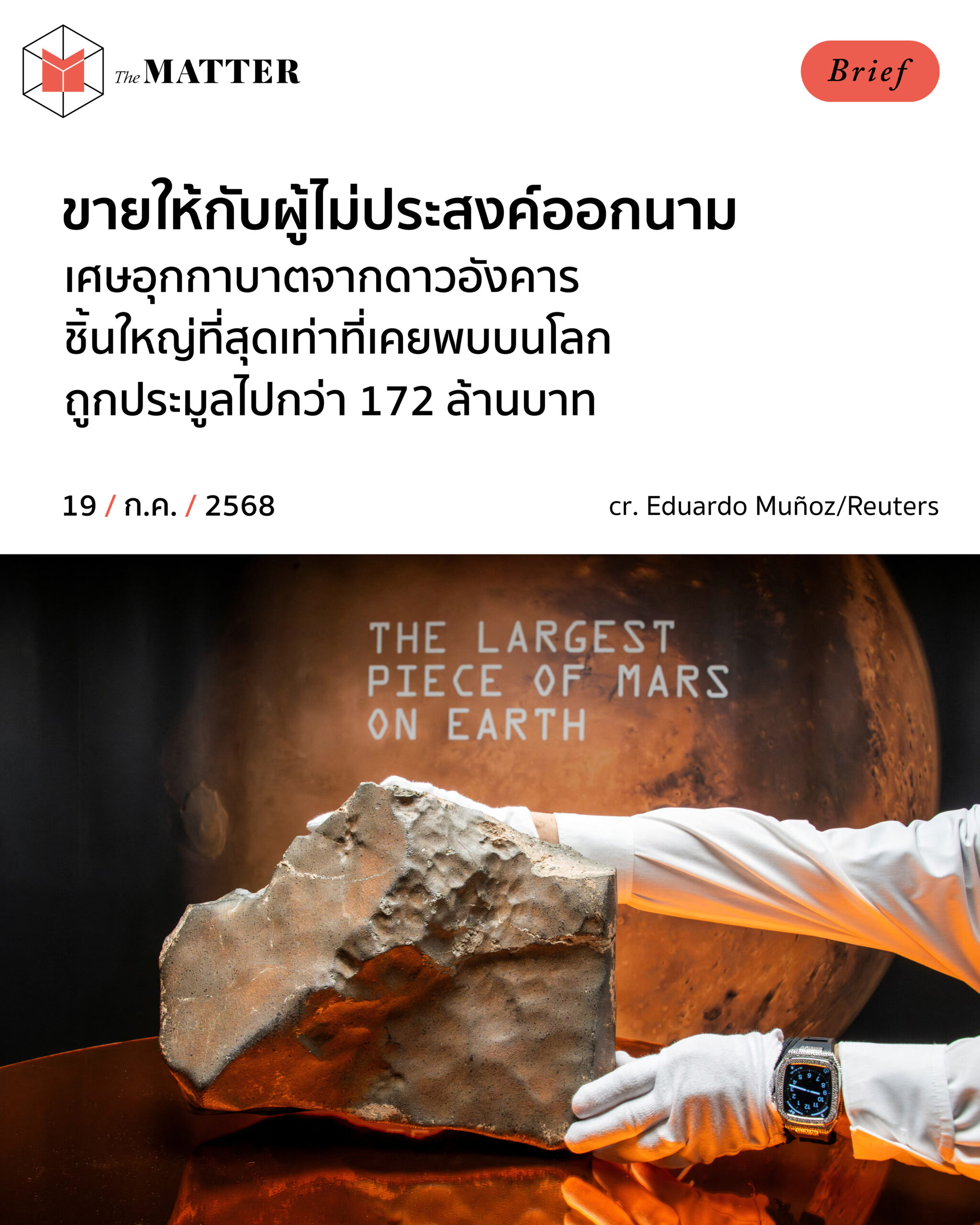 อุกกาบาตจากดาวอังคารชิ้นใหญ่ที่สุดเท่าที่เคยพบบนโลก ถูกประมูลไปในราคากว่า 5.3 ล้านดอลลาร์สหรัฐ (ราว 172 ล้านบาท) หลังรวมภาษี โดยผู้ประมูลที่ไม่เปิดเผยตัวตน ในการประมูลที่นครนิวยอร์ก เมื่อวันพุธที่ผ่านมา (16 กรกฎาคม 2025)