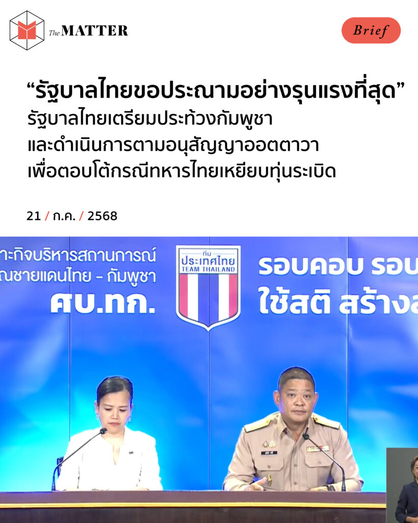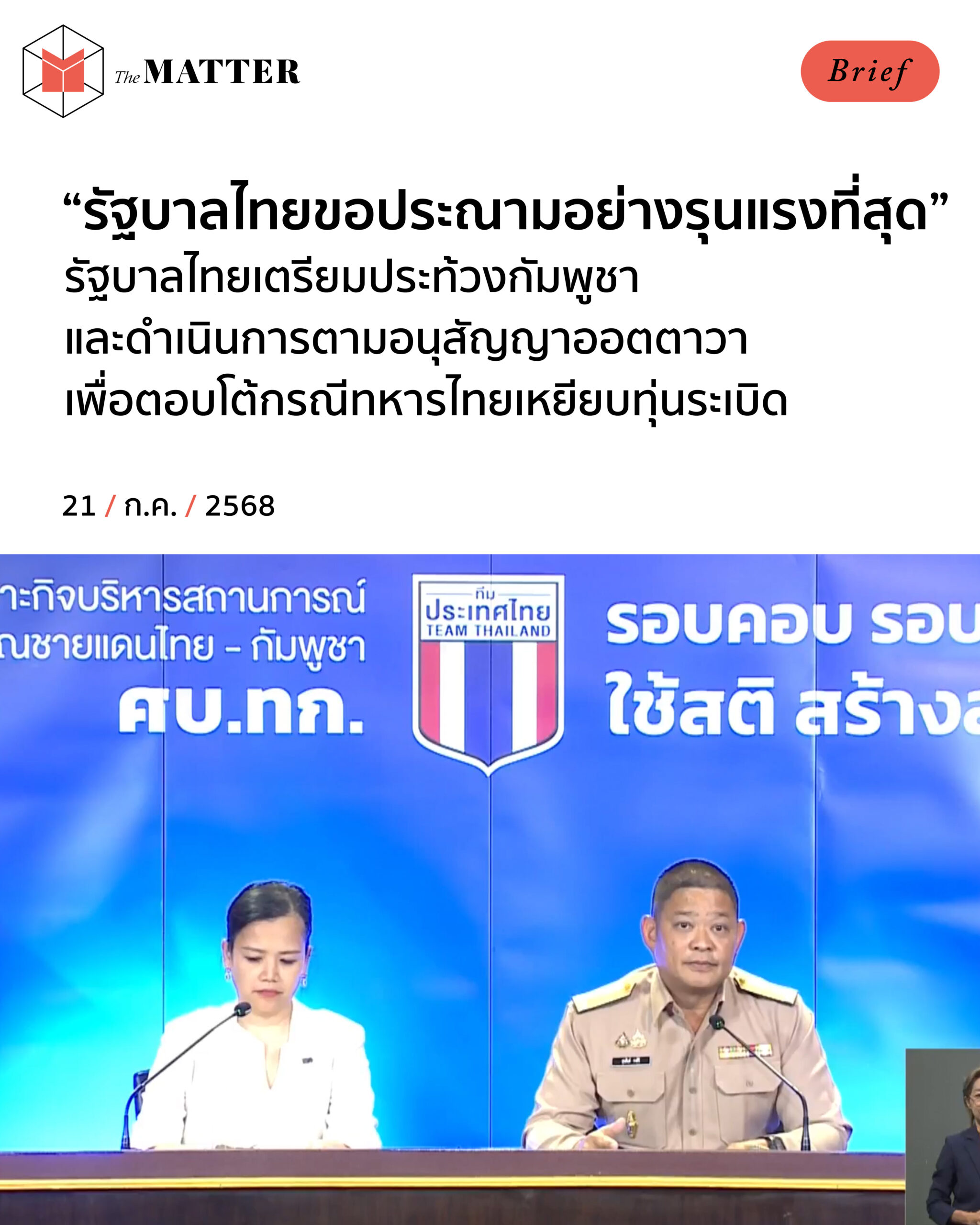 วันนี้ (21 กรกฎาคม 2568) พลเรือตรีสุรสันต์ คงสิริ รองโฆษกกองบัญชาการกองทัพไทย ในฐานะโฆษกศูนย์เฉพาะกิจบริหารสถานการณ์บริเวณชายแดนไทย-กัมพูชา (ศบ.ทก.) แถลงข่าวสรุปการประชุมกรณีมาตรการตอบโต้กัมพูชา กรณีทหารไทย 3 นาย ได้รับบาดเจ็บจากการเหยียบระเบิด ขณะลาดตระเวนบริเวณช่องบก อ.น้ำยืน จ.อุบลราชธานี เมื่อวันที่ 16 กรกฎาคมที่ผ่านมา