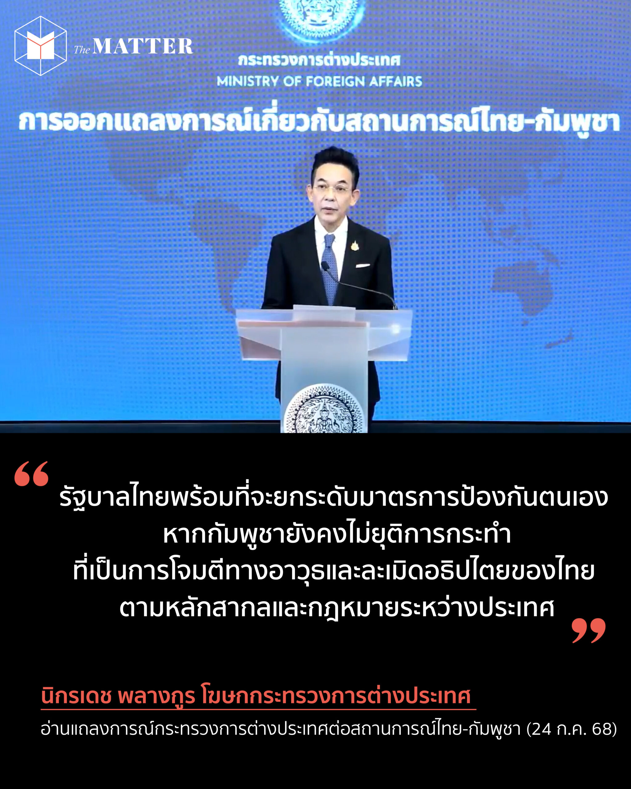หนึ่ง รัฐบาลไทยขอประณามอย่างรุนแรงที่สุดต่อการกระทำของกองทัพกัมพูชา ที่ละเมิดอธิปไตยของไทยและกฎหมายระหว่างประเทศ ต่อเหตุการณ์ที่ฝ่ายกัมพูชา ลอบเข้ามาวางกับระเบิดในดินแดนไทย และเป็นผลให้ทหารไทยได้รับบาดเจ็บเมื่อวันที่ 16 และ 23 กรกฎาคม 2568 และได้เปิดฉากยิงเข้ามาบริเวณตรงข้ามฐานปฏิบัติการของฝ่ายไทย ในช่วงเช้าของวันที่ 24 กรกฎาคม 2568 รวมทั้งได้โจมตีอย่างรุนแรงต่อเนื่องในพื้นที่ฝั่งไทยตลอดเช้านี้ โดยกระทบถึงเป้าหมายพื้นที่พลเรือนและโรงพยาบาล เป็นเหตุให้ประชาชนบาดเจ็บและเสียชีวิต
