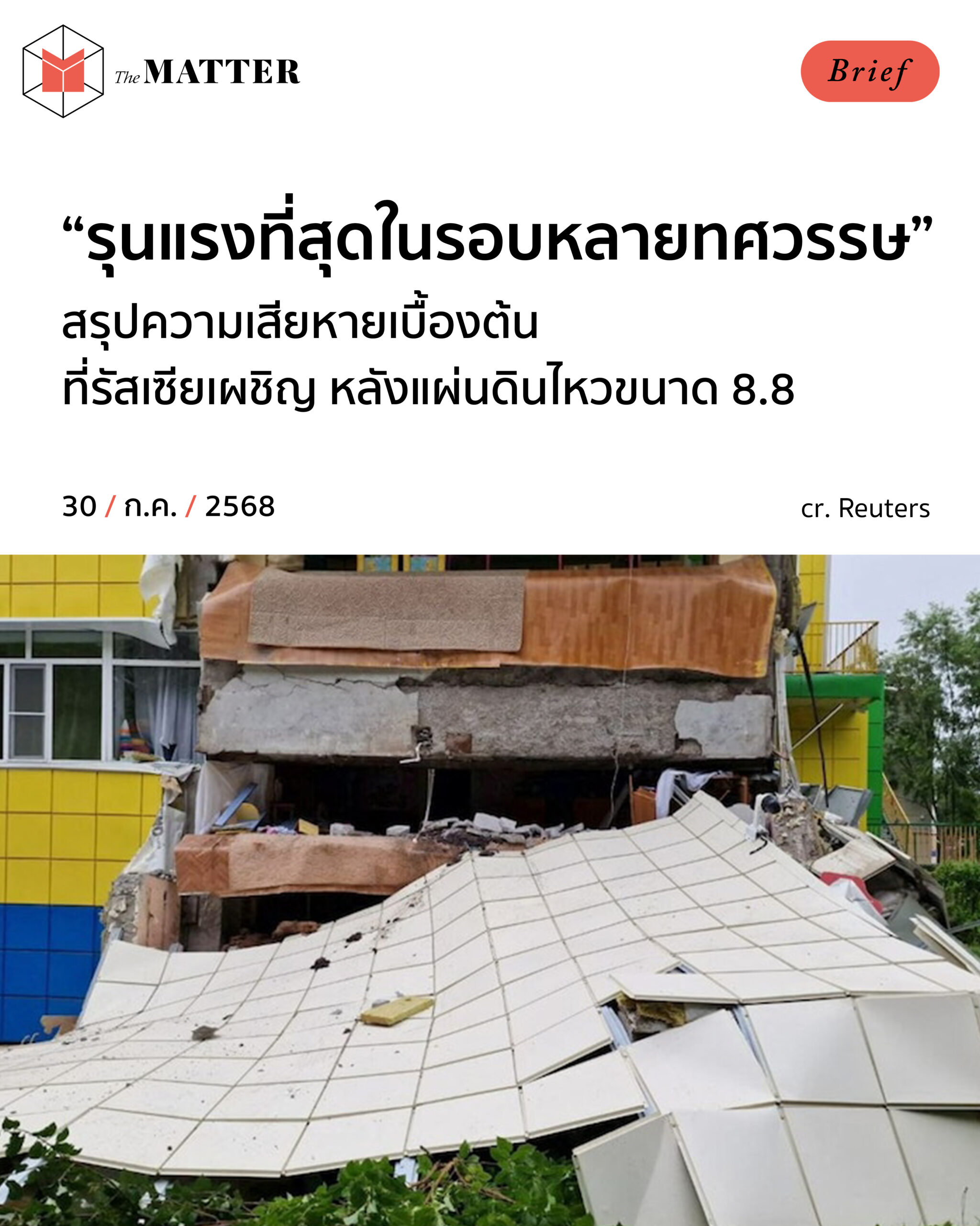 วันนี้ (30 กรกฎาคม 2025) เวลา 6.24 น. ตามเวลาประเทศไทย เกิดแผ่นดินไหว ความลึก 20.7 ก.ม. ขนาด 8.8 แมกนิจูด บริเวณแหลมคัมชัตกา (Kamchatka) นอกชายฝั่งของประเทศรัสเซีย โดยเกิดอาฟเตอร์ช็อกตามมาหลายครั้ง และมีความรุนแรงตั้งแต่ 5.2 ถึง 6.9 แมกนิจูด