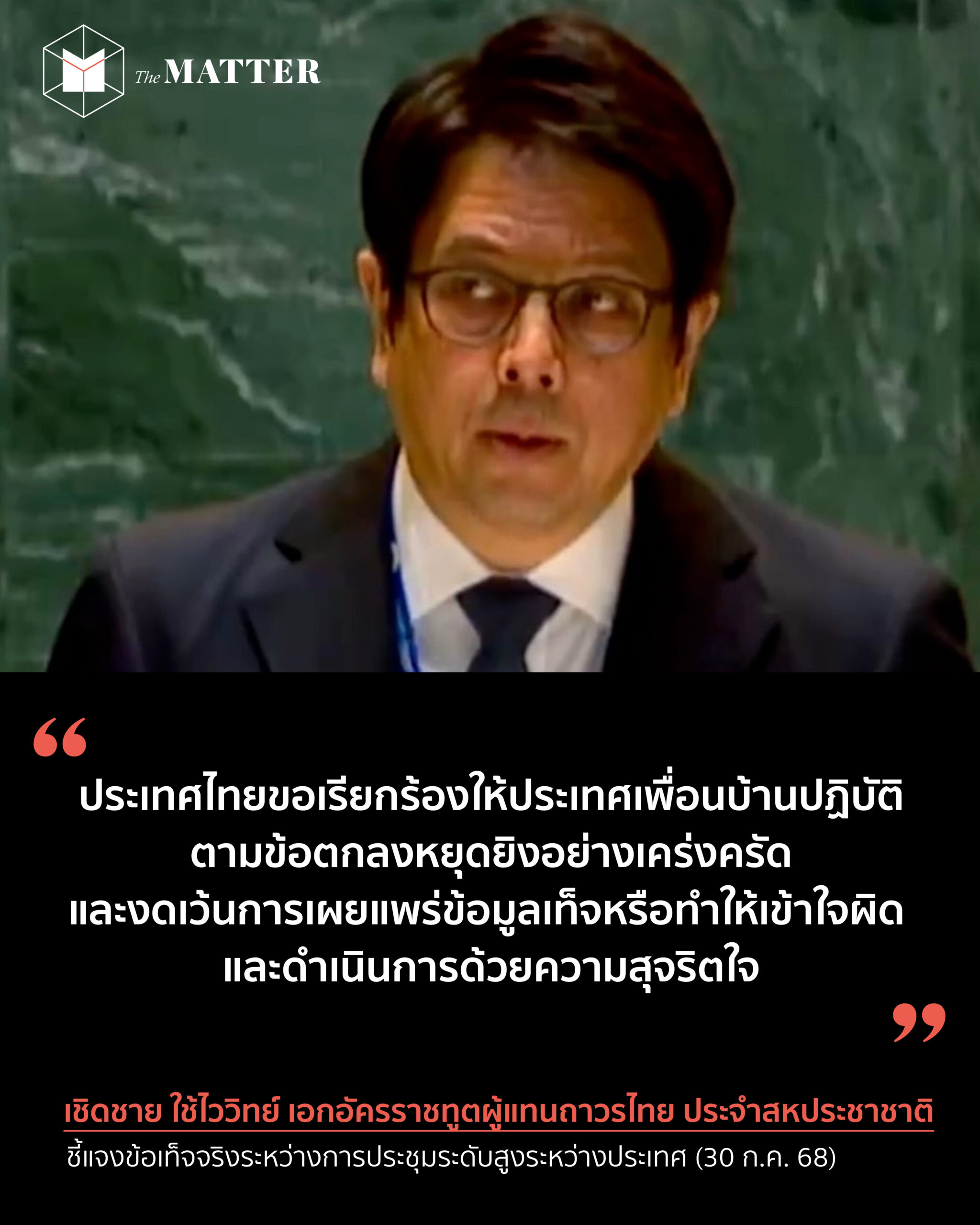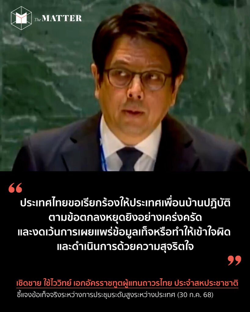 วานนี้ (30 กรกฎาคม 2568) มีการประชุมระดับสูงระหว่างประเทศว่าด้วยการระงับข้อพิพาทปัญหาปาเลสไตน์ โดยสันติวิธีและการดำเนินการตามแนวทางสองรัฐ โดย เชิดชาย ใช้ไววิทย์ เอกอัครราชทูต ผู้แทนถาวรไทย ประจำสหประชาชาติ ได้ชี้แจงข้อเท็จจริงเรื่องการละเมิดข้อตกลงหยุดยิงของกัมพูชา หลังจากที่โดนกล่าวพาดพิงถึงสถานการณ์ชายแดนในการประชุม