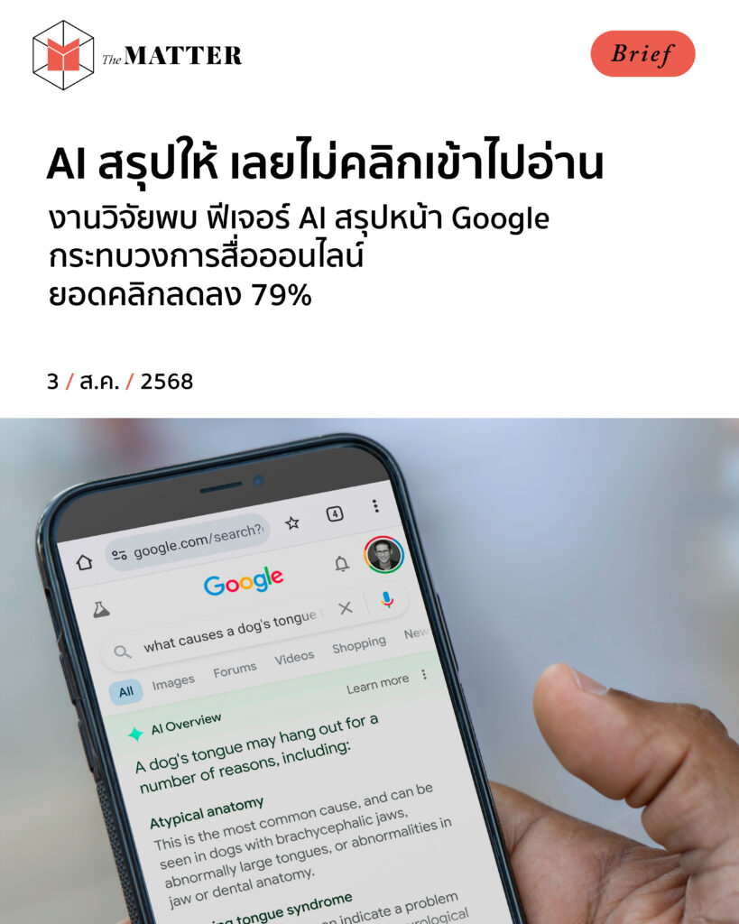 เมื่อเราสงสัยเรื่องอะไรสักอย่าง แล้วค้นหาข้อมูลผ่าน Google เดิมทีกว่าจะได้คำตอบก็ต้องกดเข้าไปอ่านอย่างน้อยสัก 1 เว็บไซต์ แต่สมัยนี้ที่มีสรุปจาก AI ให้อ่านตั้งแต่ต้น คนยังกดเข้าไปในเว็บไซต์อยู่หรือเปล่า?