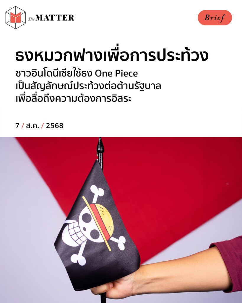 “ฉันจะเป็นราชาโจรสลัดให้ได้เลย!” แต่อาจจะไม่ใช่แค่โจรสลัด เพราะตอนนี้ สัญลักษณ์หัวกะโหลกสวมหมวกฟางที่เราคุ้นตาจากการ์ตูนอนิเมะชื่อดังอย่าง One Piece อาจไม่ได้สะท้อนถึงแค่ตัวละครโจรสลัดเพียงอย่างเดียวแล้ว เมื่อมันกลายเป็นสัญลักษณ์ของการประท้วงรัฐบาลในอินโดนีเซีย