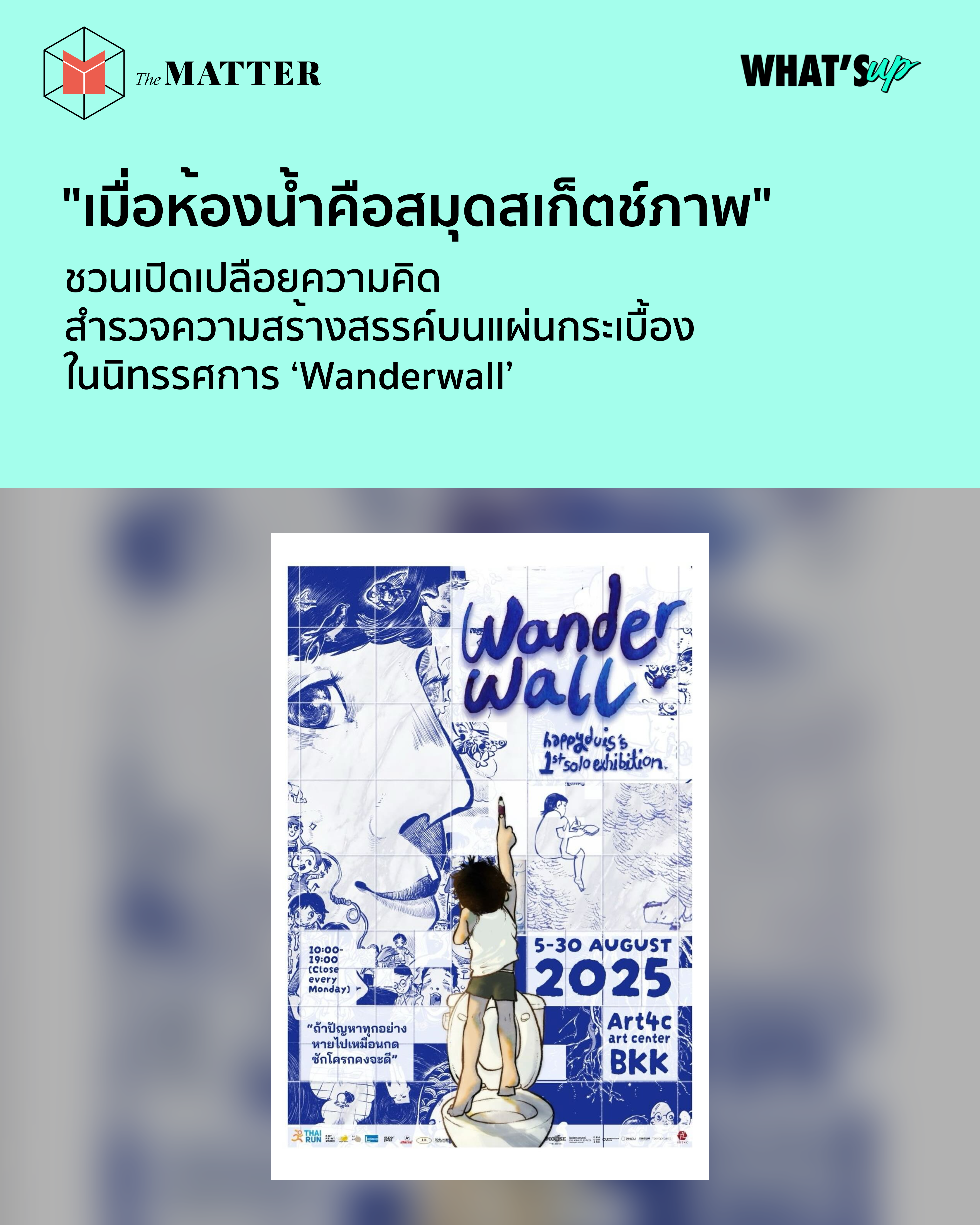 ถ้าจะพูดถึงห้องที่มีความเป็นส่วนตัวมากที่สุด ก็คงจะเป็นที่ไหนไม่ได้นอกจากห้องน้ำ เพราะนอกจากจะเป็นห้องปลดทุกข์แล้ว ยังเป็นห้องที่เราเปิดเปลือยความรู้สึกได้แบบหมดเปลือก ด้วยเหตุนี้ ศิลปินอย่าง Happyduis จึงใช้พื้นที่ในห้องน้ำเป็นทั้งที่ปลดปล่อยความคิด และผลงานศิลปะ จนกลายมาเป็น ‘Wanderwall’ นิทรรศการเดี่ยวครั้งแรก
