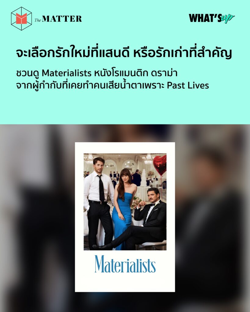 Materialists (2025) ภาพยนตร์โรแมนติก ดราม่า คอมเมดี้ ว่าด้วยเรื่องราวของ ลูซี่ เมสัน (รับบทโดย ดาโกต้า จอห์นสัน) แม่สื่อผู้แพรวพราวในการจับคู่รักให้คนนู้นคนนี้ พร้อมด้วยอุดมการณ์อันแน่วแน่อย่างการยอมตายอย่างโดดเดี่ยวหากไม่ได้แต่งงานกับคนรวย กระทั่งเธอได้พบกับ แฮร์รี่ (รับบทโดย เปโดร ปาสคาล) เศรษฐีหนุ่มผู้แสดงออกอย่างชัดแจ้งถึงความสนใจในตัวเธอ ทว่าสถานการณ์ความรักกลับทวีความวุ่นวายมากขึ้น เมื่อจอห์น (รับบทโดย คริส อีแวน) อดีตคนรัก ผู้ไม่ได้มีหน้าที่การงานที่เลิศเลอ กลับมาเจอกับเธออีกครั้ง นำไปสู่ทางเลือกอันแสนท้าทาย และมันอาจเป็นบทสรุปสุดท้ายของความรักที่เธอเฝ้ารอ