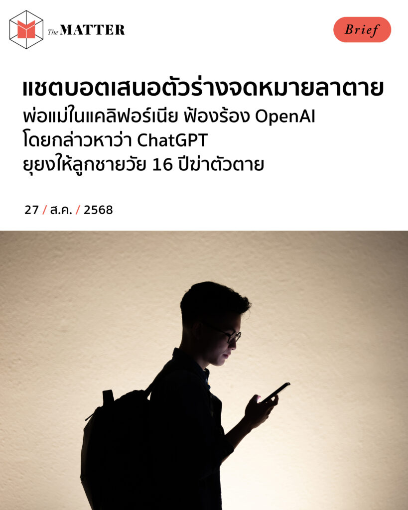 พ่อแม่ชาวแคลิฟอร์เนียได้ฟ้องร้อง OpenAI และซีอีโอ แซม อัลท์แมน (Sam Altman) กรณีการเสียชีวิตของลูกชายวัย 16 ปี โดยกล่าวหาว่า ChatGPT ยุยงให้เขาฆ่าตัวตาย พร้อมเสนอตัวช่วยร่างจดหมายลาตาย
