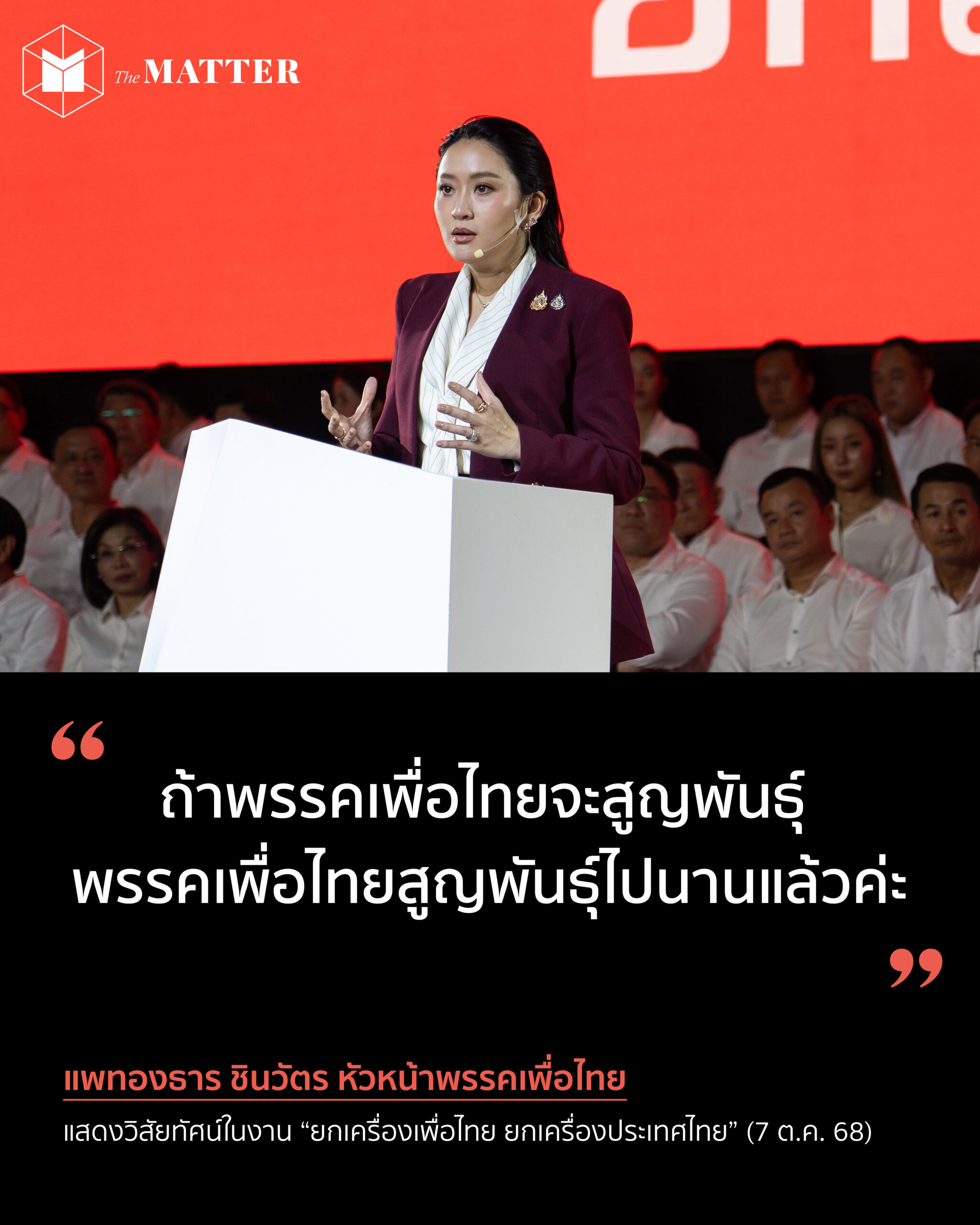 ในงาน “ยกเครื่องเพื่อไทย ยกเครื่องประเทศไทย” วันนี้ (7 ตุลาคม 2568) แพทองธาร ชินวัตร อดีตนายกฯ และหัวหน้าพรรคเพื่อไทย เปิดตัวแคมเปญใหม่ของพรรคเพื่อไทย รวมถึงแนะนำว่าที่ สส. 185 คน สำหรับการเลือกตั้งครั้งหน้า