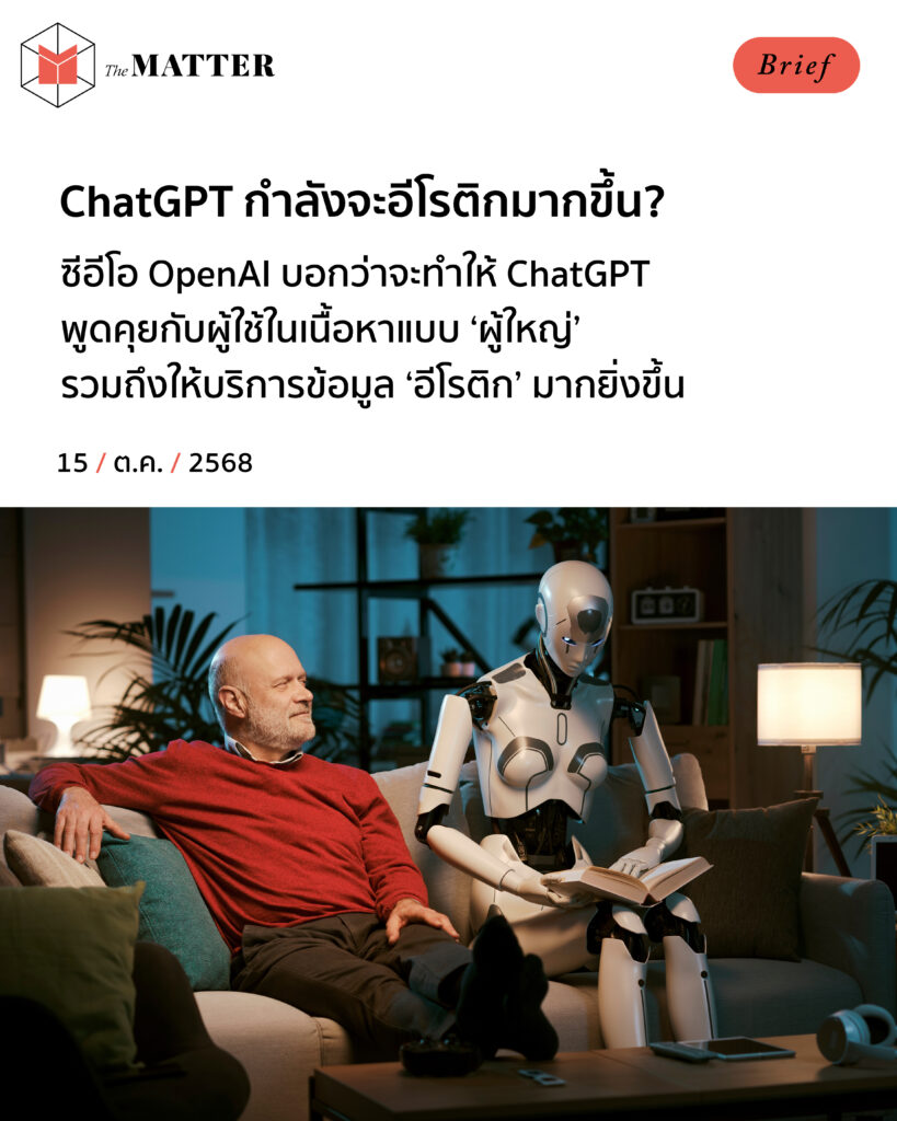 โดยล่าสุด แซม อัลท์แมน ซีอีโอ OpenAI (เจ้าของ ChatGPT) บอกว่า บริษัทวางแผนว่าจะอนุญาตให้แชตบอตยอดนิยมอย่าง ChatGPT มีเนื้อหาที่หลากหลายมากขึ้น รวมถึงเนื้อหาแบบอีโรติก ซึ่งเป็นส่วนหนึ่งของการผลักดันให้แชตบอตปฏิบัติต่อผู้ใช้แบบ ‘ผู้ใหญ่’