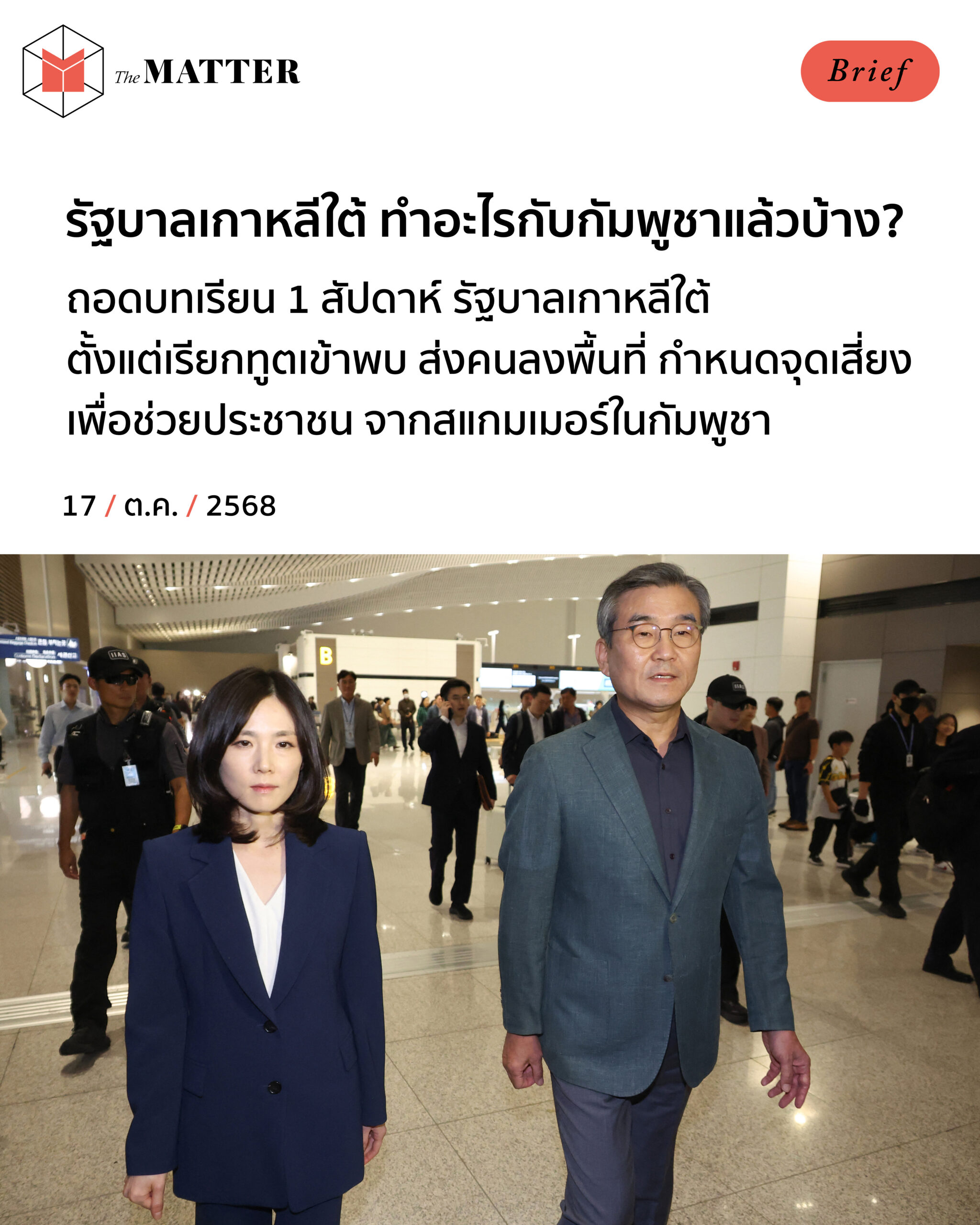 จากกรณีการเสียชีวิตของนักศึกษาชาวเกาหลีใต้วัย 22 ปี ที่ถูกหลอกไปทำงานและถูกทำร้ายร่างกายจนเสียชีวิตในกัมพูชา กลายเป็นชนวนสำคัญที่จุดกระแสให้รัฐบาลเกาหลีใต้พยายามเข้ามาแก้ปัญหาสแกมเมอร์ The MATTER ขอรวบรวมความเคลื่อนไหวของรัฐบาลเกาหลีใต้ในช่วงราวหนึ่งสัปดาห์ที่ผ่านมามาให้ทุกคนที่ติดตามกัน ด้วยความหวังว่าความเคลื่อนไหวเหล่านี้จะเป็นกรณีศึกษาให้เราได้ไม่มากก็น้อย