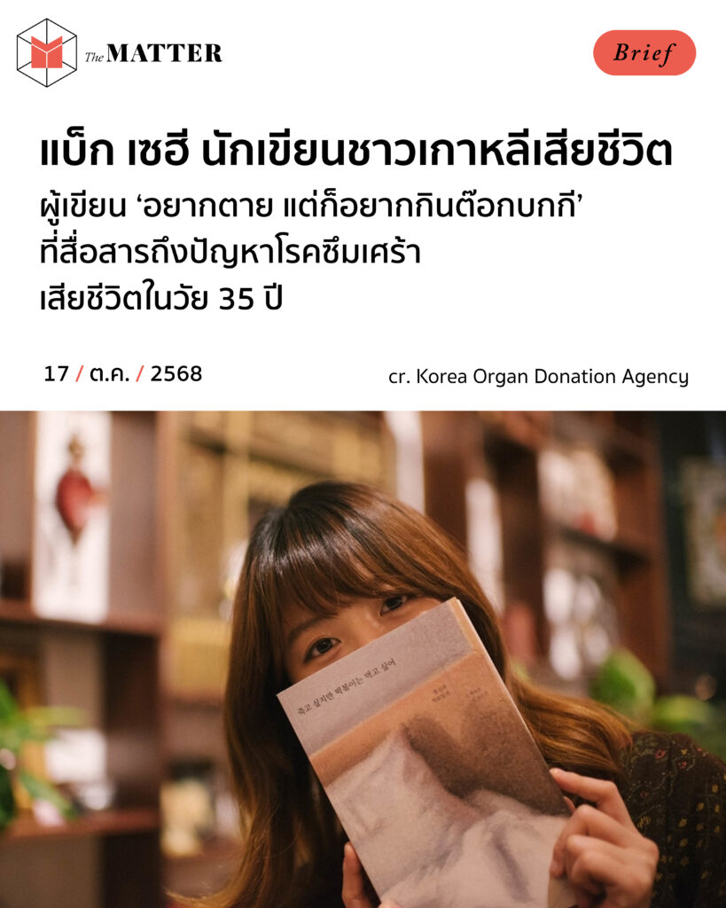 วันนี้ (17 ตุลาคม 2025) สื่อหลายแห่งรายงานข่าวการเสียชีวิตของนักเขียน แบ็ก เซฮี (Baek Se-hee) เจ้าของหนังสือ ‘อยากตาย แต่ก็อยากกินต๊อกบกกี’ (I Want to Die but I Want to Eat Tteokbokki) โดยยังไม่มีการเปิดเผยรายละเอียดเพิ่มเติมเกี่ยวกับการเสียชีวิตของเธอ