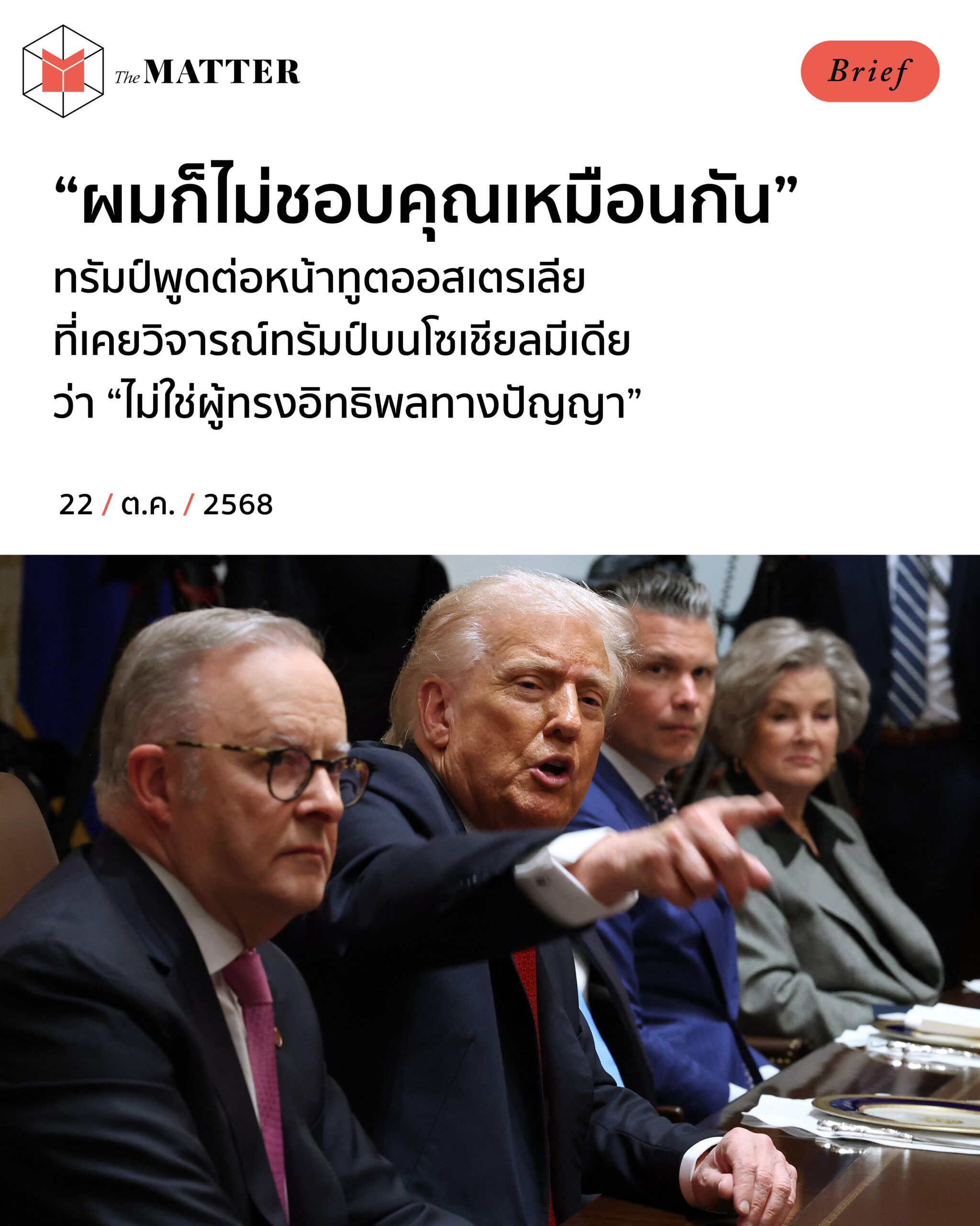 เมื่อวันจันทร์ (20 ตุลาคม 2025) ที่ผ่านมา ถือเป็นครั้งแรกที่แอนโทนี อัลบาเนซี (Anthony Albanese) นายกรัฐมนตรีออสเตรเลีย ได้พบปะกันแบบตัวต่อตัวกับโดนัลด์ ทรัมป์ (Donald Trump) ประธานาธิบดีสหรัฐฯ ที่ทำเนียบขาว