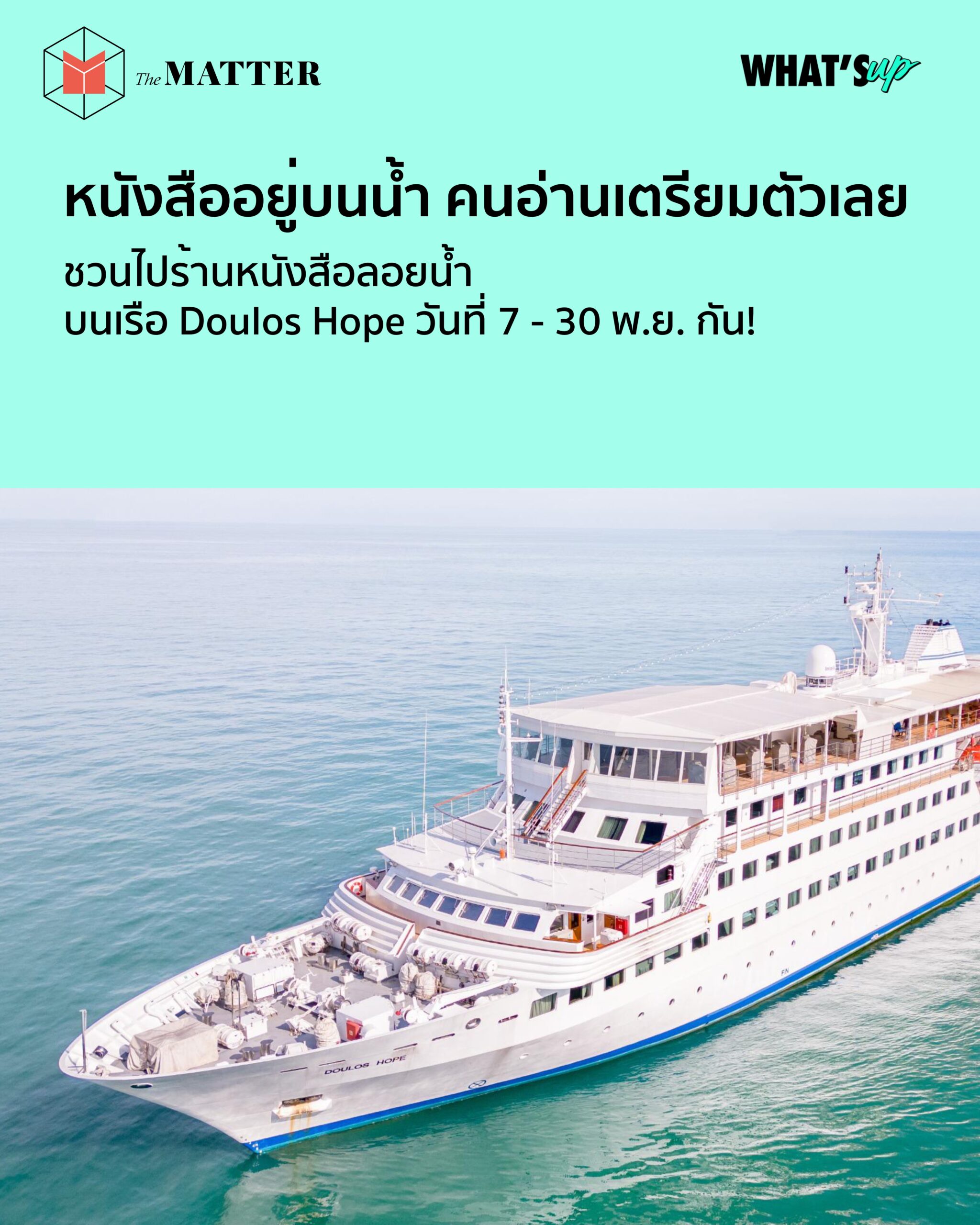 แต่ก่อนจะเตรียมตัวไปขึ้นเรือ เราชวนมาทำความรู้จักเรือ Doulos Hope กันสักนิด โดยเรือ Doulos Hope เป็นเรือลำใหม่ล่าสุดของกองกองเรือ GBA Ships ซึ่งเป็นเป็นองค์กรการกุศลของเยอรมนี นับตั้งแต่ปี 1970 มีภารกิจหลักคือการแบ่งปันความรู้ ให้ความช่วยเหลือ และให้ความหวังแก่ผู้คน ผ่านร้านหนังสือขนาดยักษ์ที่บรรทุกไปเต็มเรือ โดยจะจอดเทียบท่าเป็นเวลาหลายสัปดาห์ เพื่อต้อนรับนักอ่านจากทั่วโลก ภายในร้านหนังสือหลากหลายหมวดหมู่ ไม่ว่าจะเป็น วรรณกรรม หนังสือภาพสำหรับเด็ก ธุรกิจและจิตวิทยาพัฒนาตัวเอง ไปจนถึงหนังสือทำอาหาร หรือหนังสือฝึกภาษา ฯลฯ