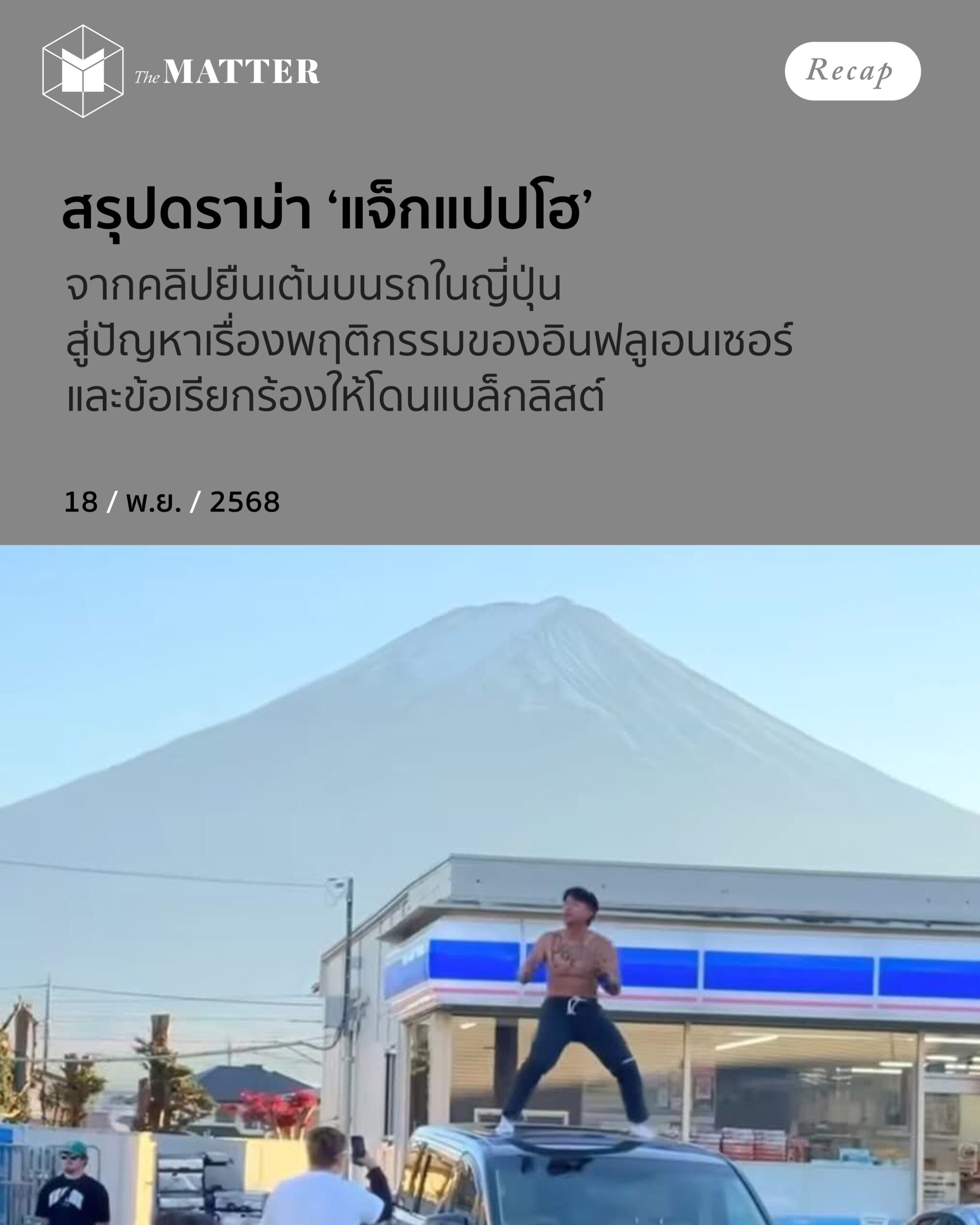 - เรื่องมันเริ่มมาจากที่เฟซบุ๊กแจ็กแปปโฮ (จาตุรงค์ พาโพธิ์) อินฟลูฯ และยูทูบเบอร์สายตลก โพสต์คลิปวิดีโอเต้นอยู่บนหลังคารถ โดยที่ด้านหลังเป็นวิวร้านค้าสะดวกซื้อลอว์สันและภูเขาไฟฟูจิ ซึ่งเป็นวิวยอดนิยมของนักท่องเที่ยว และเป็นพื้นที่ที่เคยมีประเด็นการนำรั้วมากั้นไม่ให้นักท่องเที่ยวมาถ่ายรูป หลังนักท่องเที่ยวทำพฤติกรรมไม่เหมาะสม