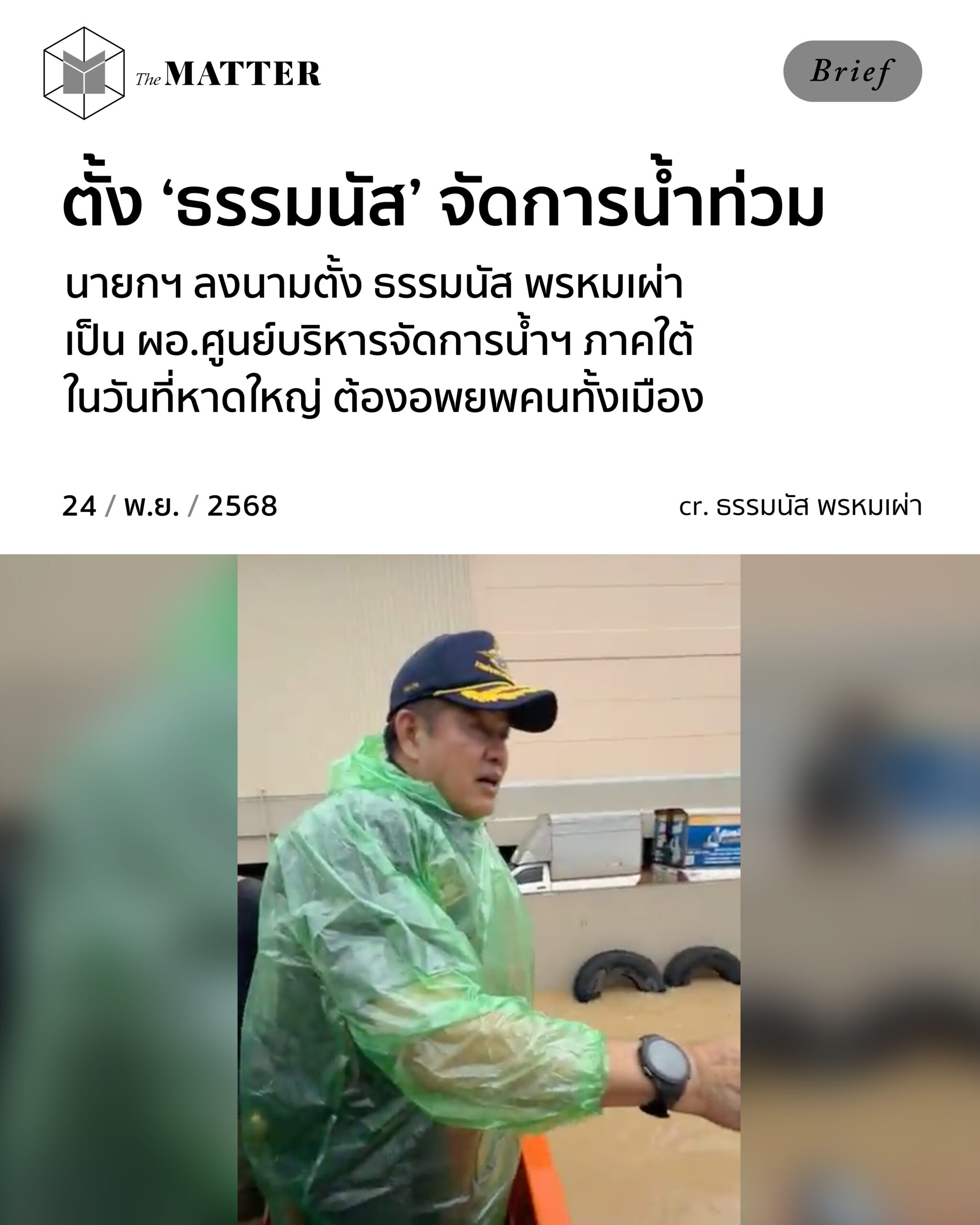 สถานการณ์น้ำท่วมภาคใต้ยังคงน่าเป็นห่วง โดยล่าสุดอนุทิน ชาญวีรกูล นายกรัฐมนตรี ได้ลงนามจัดตั้งศูนย์บริหารจัดการน้ำในสถานการณ์ภัยพิบัติทางธรรมชาติ (ศนภ.) โดยให้ร้อยเอก ธรรมนัส พรหมเผ่า รองนายกรัฐมนตรี และรัฐมนตรีว่าการกระทรวงเกษตรและสหกรณ์ เป็นผู้อำนวยการศูนย์ฯ