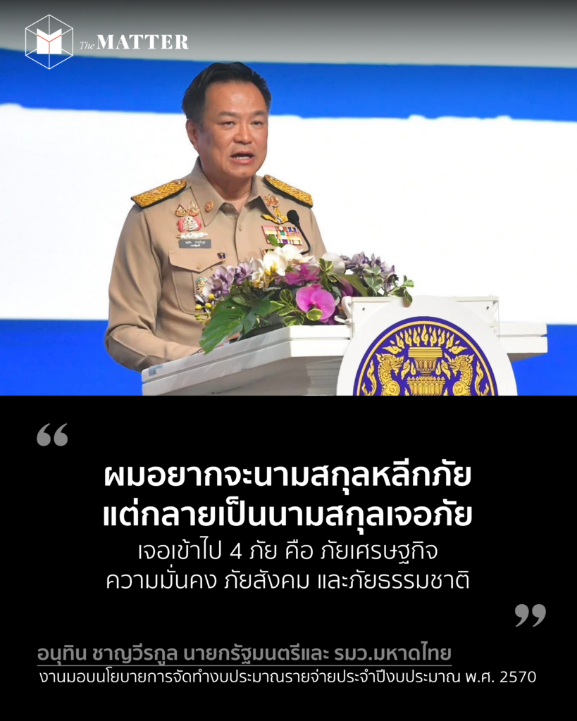 “นโยบายที่ได้แถลงมานี้ ปีนี้อาจจะต้องมีการมุ่งเน้นในเรื่องของการแก้ปัญหา 4 ภัย ที่ตนได้กล่าวเมื่อสักครู่ ผมอยากจะนามสกุลหลีกภัย แต่กลายเป็นนามสกุลเจอภัย เจอเข้าไป 4 ภัย คือภัยเศรษฐกิจ ความมั่นคง ภัยสังคม และภัยธรรมชาติ” อนุทิน กล่าว
