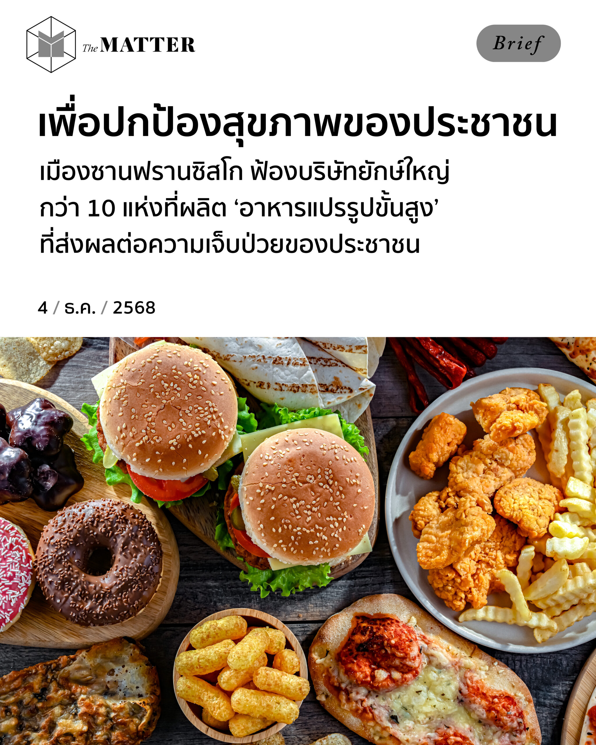 เมื่อวันอังคาร (2 ธันวาคม) ซานฟรานซิสโกได้ยื่นฟ้องบริษัทผู้ผลิตอาหารแปรรูปขั้นสูง (ultra-processed foods หรือ UPFs) โดยให้เหตุผลว่า ขณะที่บริษัทเหล่านี้ทำกำไรมากขึ้น แต่หน่วยงานภาครัฐต้องเป็นผู้รับผิดชอบค่าใช้จ่าย ในการรักษาโรคของประชาชน ที่เกิดจากการบริโภคผลิตภัณฑ์ของบริษัทเหล่านี้