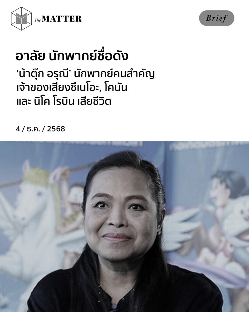 วันนี้ (4 ธันวาคม) เพจเฟซบุ๊ก ช่อง 9 การ์ตูน โพสต์ข้อความแสดงความเสียใจต่อการจากไปของ ‘น้าตุ๊ก–อรุณี นันทิวาส’ ผู้ให้เสียงพากย์การ์ตูนกว่า 100 เรื่อง ตั้งแต่ปี 2525 จนถึงปัจจุบัน