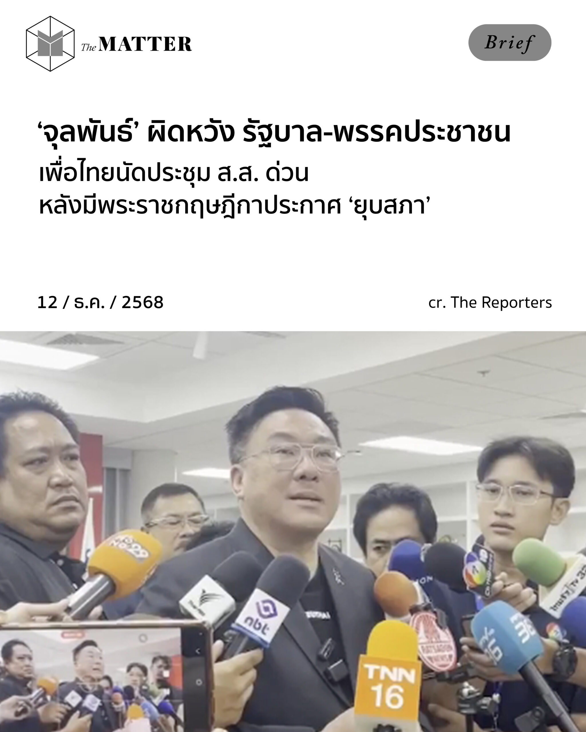 ผู้สื่อข่าวตั้งข้อสังเกตุว่าดูเหมือนพรรคภูมิใจไทยและพรรคประชาชนจะโยนกันไปมา ซึ่งทางจุลพันธ์กล่าวว่า “ไม่ต้องโยนครับ ก็รับผิดชอบทั้งคู่ เมื่อวานนี้สำหรับพรรคเพื่อไทยเราต้องแสดงความผิดหวังต่อรัฐบาลก่อน แสดงความผิดหวังอย่างไรก็คือ สภาวะประเทศขนาดนี้ ทั้งการปะทะชายแดน ทั้งเรื่องน้ำท่วมที่ยังแก้ไขไม่เสร็จ รัฐบาลกลับปัดทิ้งภาระความรับผิดชอบเลือกที่จะหนีการตรวจสอบ ก็คือการอภิปรายไม่ไว้วางใจและยุบสภา ทิ้งให้ประชาชนต้องเดือดร้อนต่อไป”