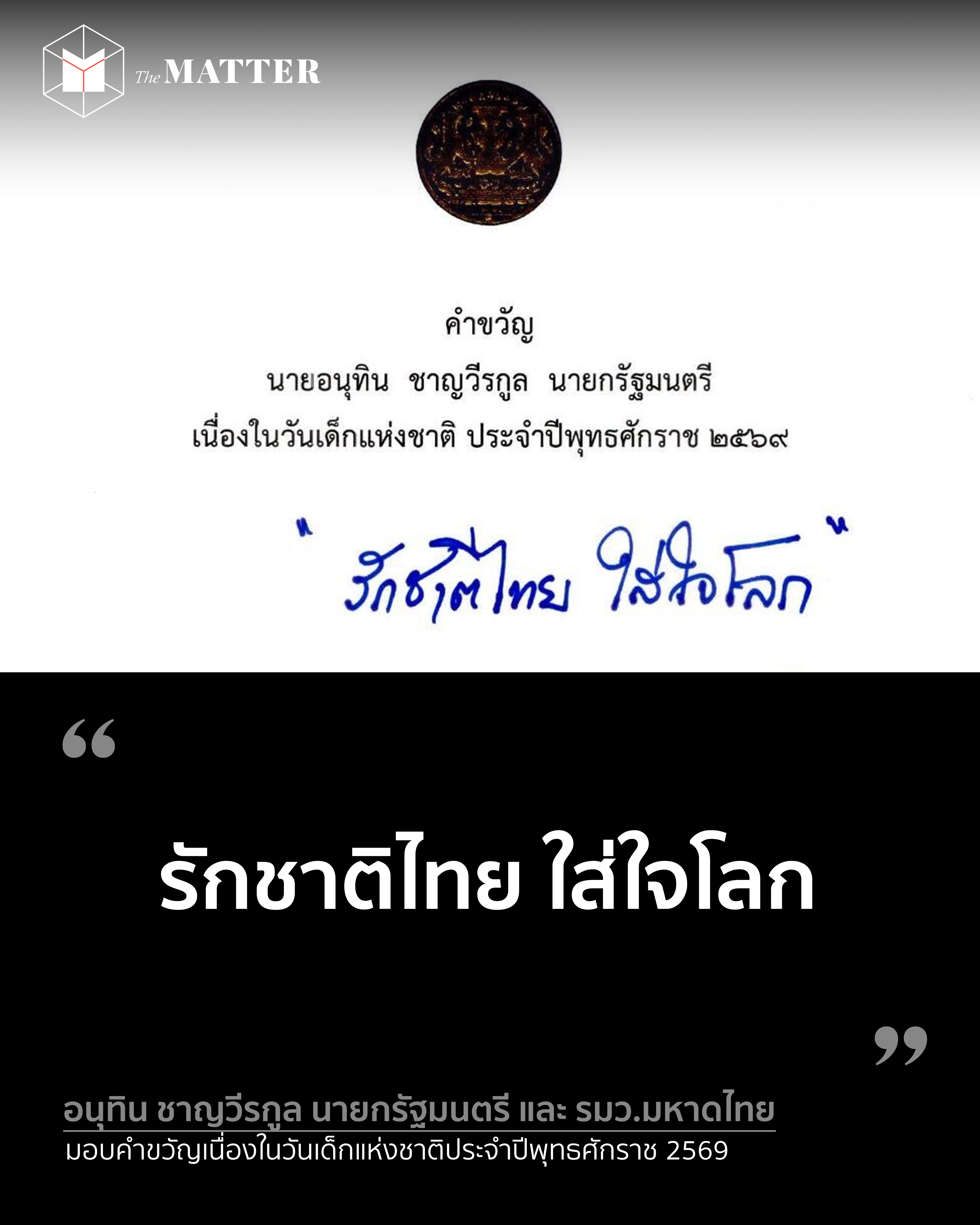 วันนี้ (16 ธันวาคม 2568) ที่ทำเนียบรัฐบาล ลลิดา เพริศวิวัฒนา รองโฆษกประจำสำนักนายกรัฐมนตรี เผยว่า อนุทิน ชาญวีรกูล นายกรัฐมนตรี ได้มอบคำขวัญเนื่องในวันเด็กแห่งชาติประจำปีพุทธศักราช 2569 ว่า “รักชาติไทย ใส่ใจโลก”