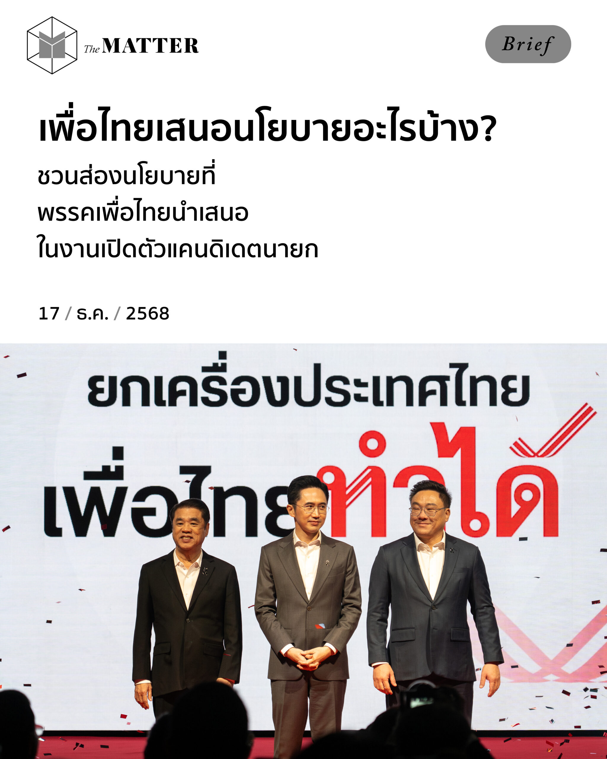 ไม่เพียงเท่านั้น ในงานยังมีการแสดงวิสัยทัศน์ของแคนดิเดตทั้งสาม พร้อมกับเล่าถึงนโยบายที่พรรคเพื่อไทยจะผลักดันหากได้เป็นแกนนำจัดตั้งรัฐบาล–วันนี้ The MATTER ชวนรู้จักนโยบายของพรรคเพื่อไทยว่า เกี่ยวกับอะไรบ้าง? มีรายละเอียดอย่างไร? และแคนดิเดตทั้งสามสัญญาไว้ว่า จะทำให้สำเร็จภายในเวลาเท่าไหร่?