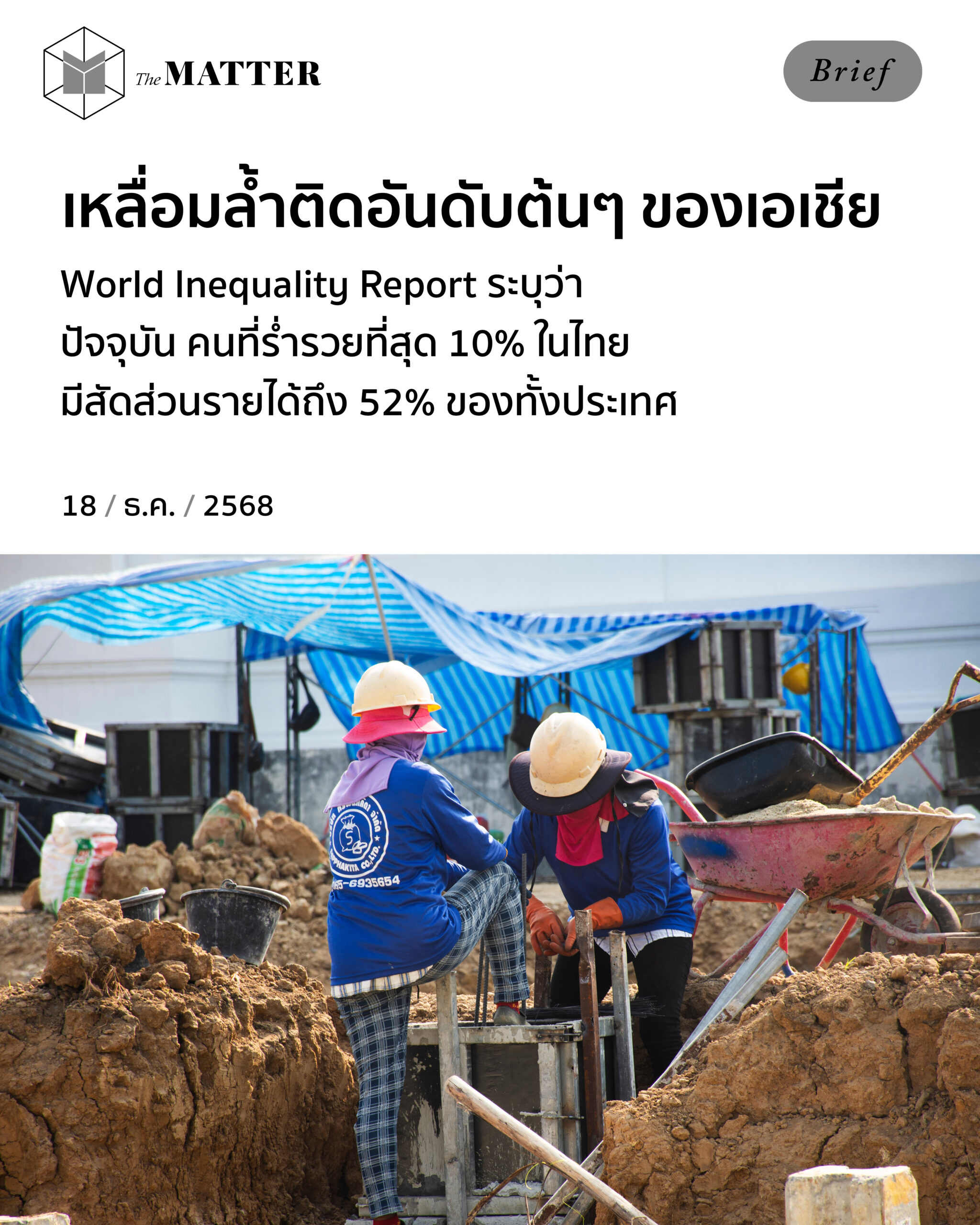 คุณคิดว่าตอนนี้ ประเทศไทยเหลื่อมล้ำมากแค่ไหน? ข้อมูลล่าสุดจาก World Inequality Report ชี้ว่าคนที่มีรายได้สูงสุด 10% ในไทย มีสัดส่วนรายได้ถึง 52% ของทั้งหมด ขณะที่กลุ่มผู้มีรายได้ต่ำสุด 50% มีสัดส่วนรายได้เพียง 11%