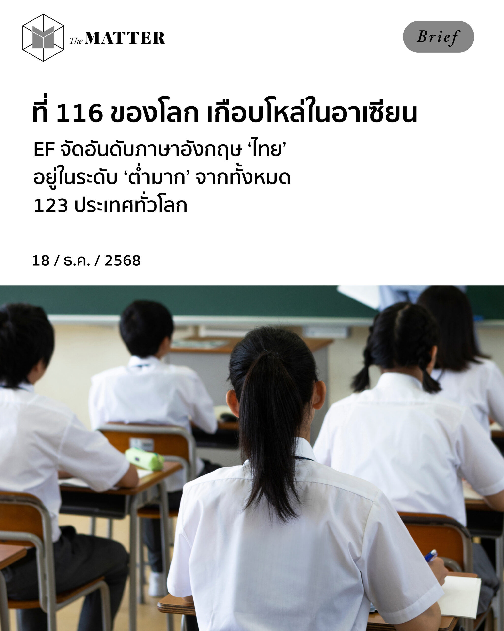 ซึ่งจุดที่น่าสนใจคือ ‘ประเทศไทย’ ของเรา อยู่ในอันดับที่ 116 จากทั้งหมด 123 ประเทศทั่วโลก ซึ่ง EF บอกว่าระดับภาษาของเรา อยู่ในระดับ Very Low Proficiency หรือแปลง่ายๆ ว่า ความสามารถต่ำมาก นั่นเอง