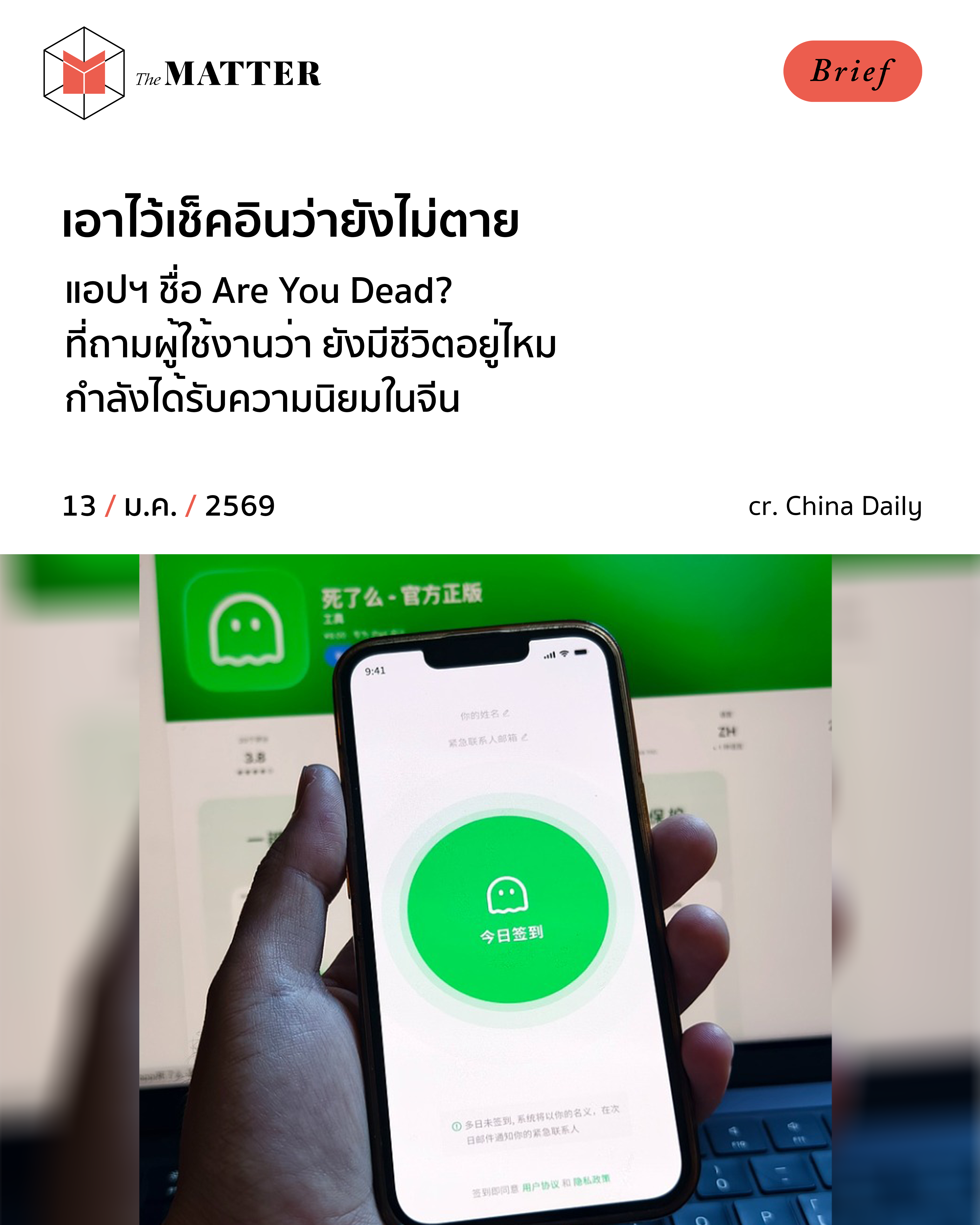 แอปพลิเคชั่น ‘Are You Dead?’ เกิดจากทีมผู้สร้างเล็กๆ 3 คน ในมณฑลเหอหนาน ที่ต้องการเจาะกลุ่มเป้าหมายพนักงานออฟฟิศ หรือนักเรียนที่อาศัยอยู่นอกบ้าน หรือใครก็ตามที่เลือกใช้ชีวิตแบบโดดเดี่ยว โดยโฆษณาว่าจะเป็นมิตรสหายที่ช่วยดูแลความปลอดภัยให้กับคนเหล่านี้