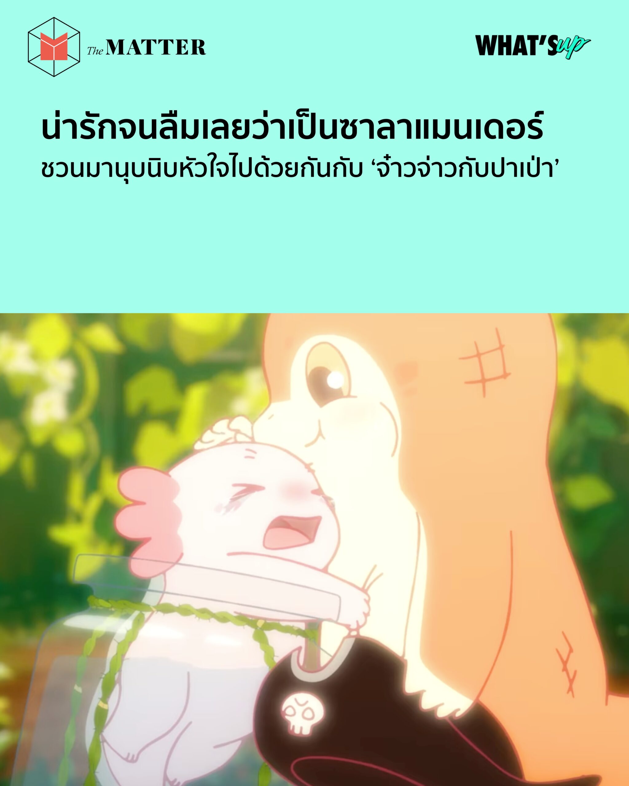 ช่วงนี้หลายคนอาจจะได้เห็นคาแรกเตอร์ซาลาแมนเดอร์สุดน่ารักผ่านทามไลน์กันมาบ้าง โดยอนิเมชั่นเรื่องนี้มาจากครีเอเตอร์ชาวฮ่องกง 李合适Riggy หรือ wigglewanderers มีตัวละครหลักเป็นน้องตุ๊กแกเสือดาวสีส้ม ชื่อจ๋าวจ่าว หรือภาษาอังกฤษว่า Draco ส่วนแอ็กโซลอเติ้ลหรือหมาน้ำสีชมพูชื่อ ปาเป่า หรือ Bubbleทั้งจ๋าวจ่าวและปาเป่าจะพาเราไปผจญภัยในโลกของสัตว์เลี้ยงครึ่งบกครึ่งน้ำ ที่ทั้งตลกและน่ารัก จนเกือบลืมไปเลยว่าน้องเคยเป็นตุ๊กแกมาก่อน