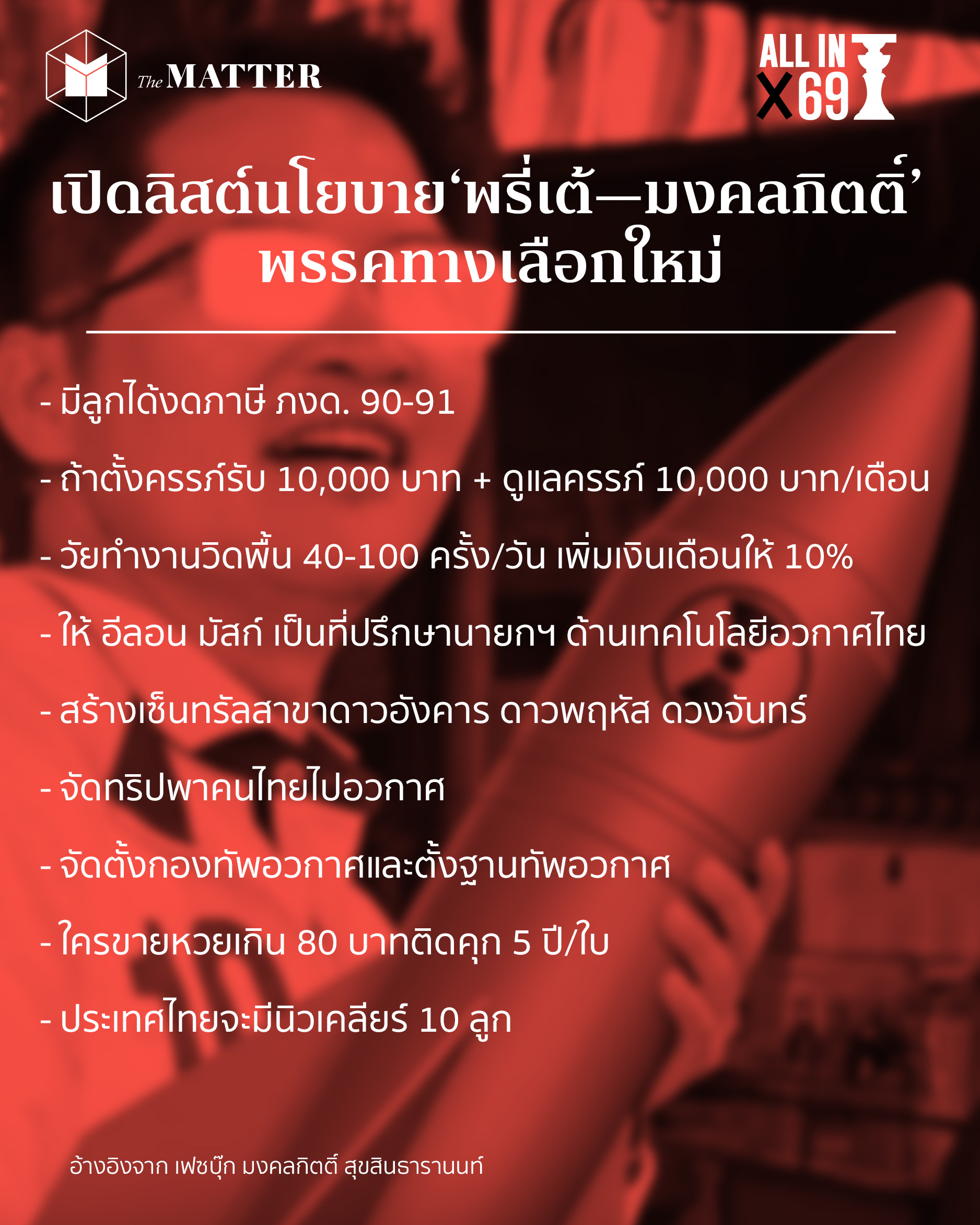 นับถอยหลังกับวันเลือกตั้งที่ขยับใกล้เข้ามาทุกที บรรดาพรรคน้อย-ใหญ่ต่างชิงเปิดตัวนโยบายเพื่อมัดใจผู้มีสิทธิเลือกตั้งกันไม่เว้นวัน แต่ในเวลานี้ก็ต้องยอมรับเลยว่าไม่นโยบายไหน เรียกเสียงฮือฮาและขมวดคิ้วในเวลาเดียวกันได้เท่านโยบายของ ‘เต้–มงคลกิตติ์ สุขสินธารานนท์’ แคนดิเดตนายกฯ และเลขาธิการพรรคทางเลือกใหม่ ซึ่งแต่ละอันจะมีอะไรบ้าง The MATTER รวม (บางอัน) มาให้ดูแล้ว!