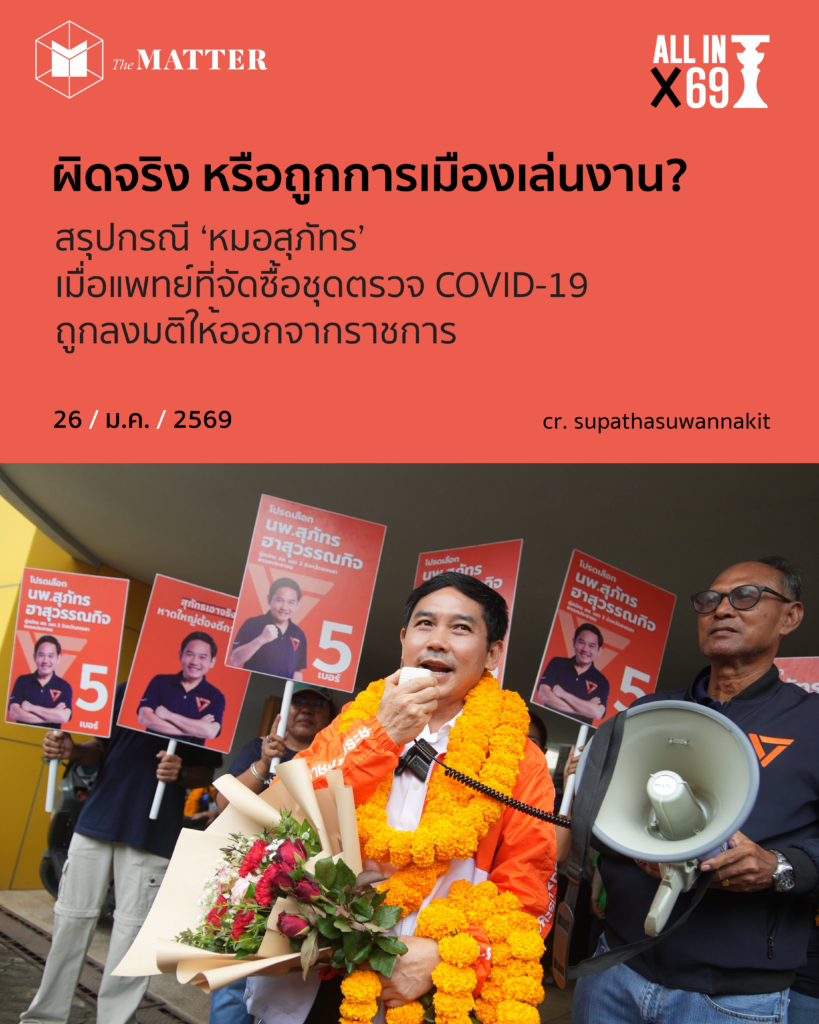 จากกรณีที่มีข่าวว่า 22 มกราคม 2569 อ.ก.พ.กระทรวงสาธารณสุข ประชุมประจำเดือนพร้อมมีมติเกี่ยวกับการพิจารณาความผิดทางวินัยให้ปลด นพ.สุภัทร ฮาสุวรรณกิจ หรือ ‘หมอสุภัทร’ อดีตผู้อำนวยการโรงพยาบาลสะบ้าย้อย ออกจากราชการ จากกรณีจัดซื้อชุดตรวจ COVID-19 โครงการแพทย์ชนบทบุกกรุง ซึ่งปัจจุบันเจ้าตัวได้ลาออกจากราชการมาเป็นผู้สมัคร สส.เขต จังหวัดสงขลา พรรคประชาชน ในการเลือกตั้งที่จะถึงนี้