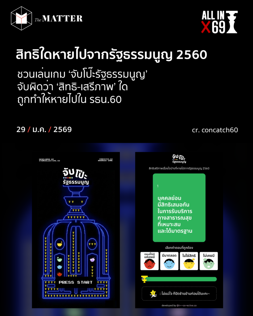 The MATTER ขอชวนทุกคนไปรู้จักกับเกม “จับโป๊ะรัฐธรรมนูญ” เกมฟรีบนหน้าเว็บไซต์ที่ชวนทุกคนร่วมจับผิดว่าสิทธิเสรีภาพใดที่ถูกทำให้หายไปจากรัฐธรรมนูญ 2560