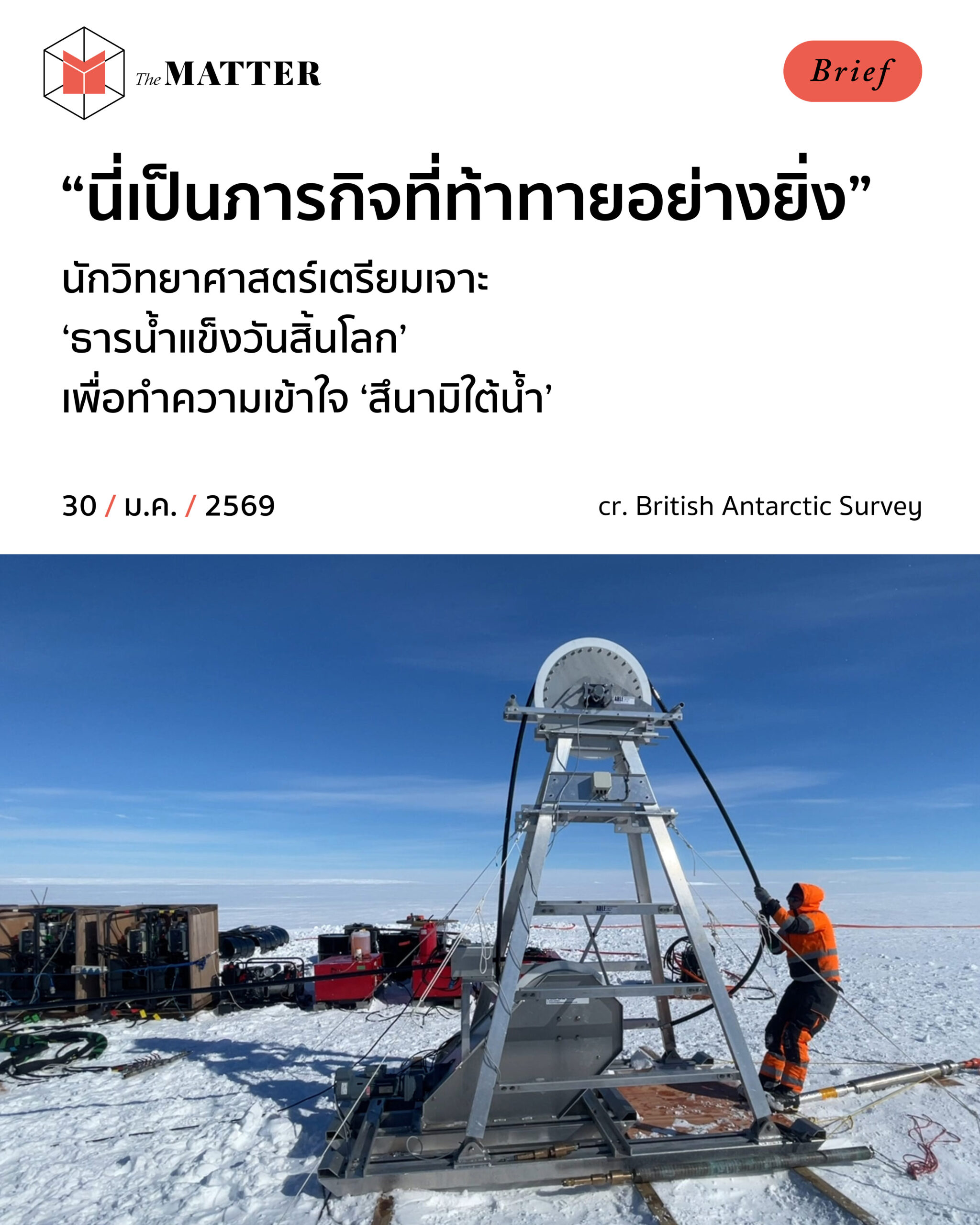 แต่ในอีก 2 สัปดาห์ข้างหน้า นักวิทยาศาสตร์กลุ่มนี้จะใช้น้ำร้อนอุณหภูมิกว่า 90 องศาเซลเซียส เจาะด้วยแรงดันสูงผ่านท่อ ลงไปในชั้นน้ำแข็งราว 1 เมตรลง และติดตั้งอุปกรณ์ที่จะส่งข้อมูลแบบเรียลไทม์จากจุดสำคัญของธารน้ำแข็งทเวทส์กลับมา