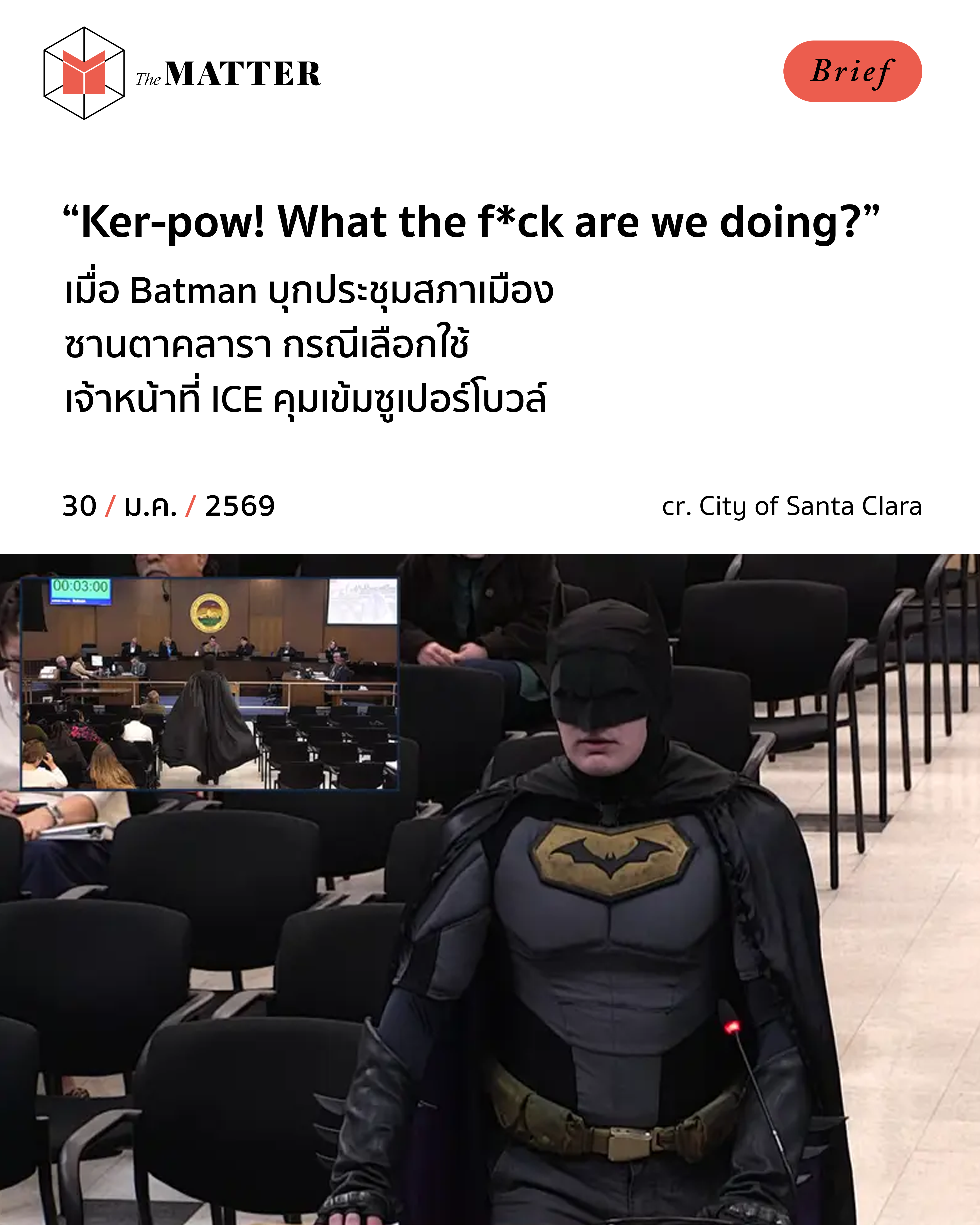 เหตุการณ์นี้เกิดขึ้นเมื่อ 27 มกราคมที่ผ่านมา ระหว่างช่วงแสดงความคิดเห็นสาธารณะ ณ สภาเมือง ซานตาคลารา รัฐแคลิฟอร์เนีย สหรัฐอเมริกา จู่ๆ ก็มีชายคนหนึ่งสวมชุด ‘Batman’ เดินตรงไปยังไมโครโฟนก่อนจะเริ่มต้นด้วยการตะโกนว่า “Ker-pow!” พร้อมทุบกำปั้นลงบนโพเดียมอย่างแรง