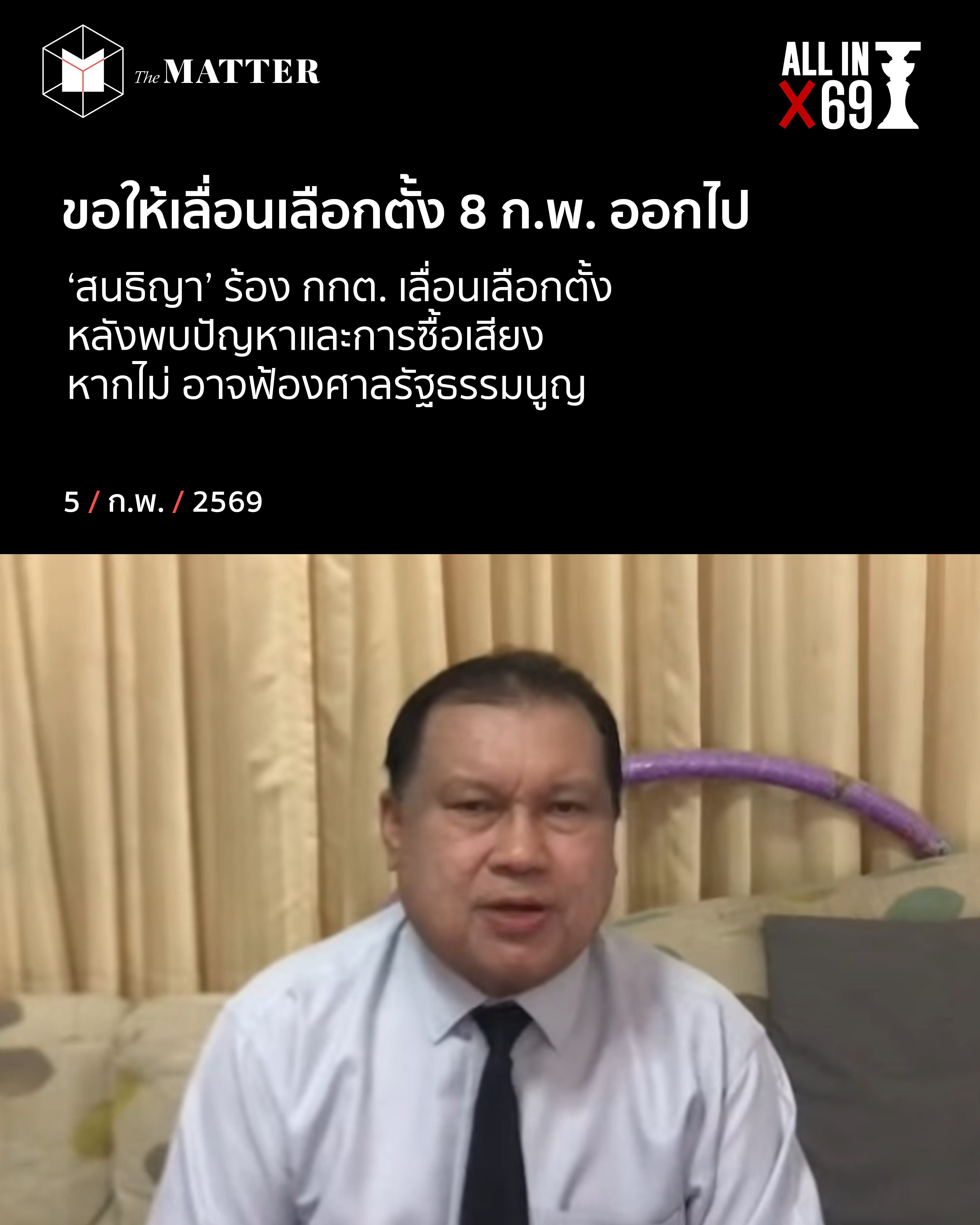 วันนี้ (5 กุมภาพันธ์ 2569) ที่สำนักงานคณะกรรมการการเลือกตั้ง สนธิญา สวัสดี ผู้สมัคร สส. สมุทรสาคร พรรคพลังประชารัฐ เข้ายื่นหนังสือถึง กกต. ขอให้พิจารณาเลื่อนการเลือกตั้งในวันที่ 8 กุมภาพันธ์นี้ ไปอีก 1-2 เดือน