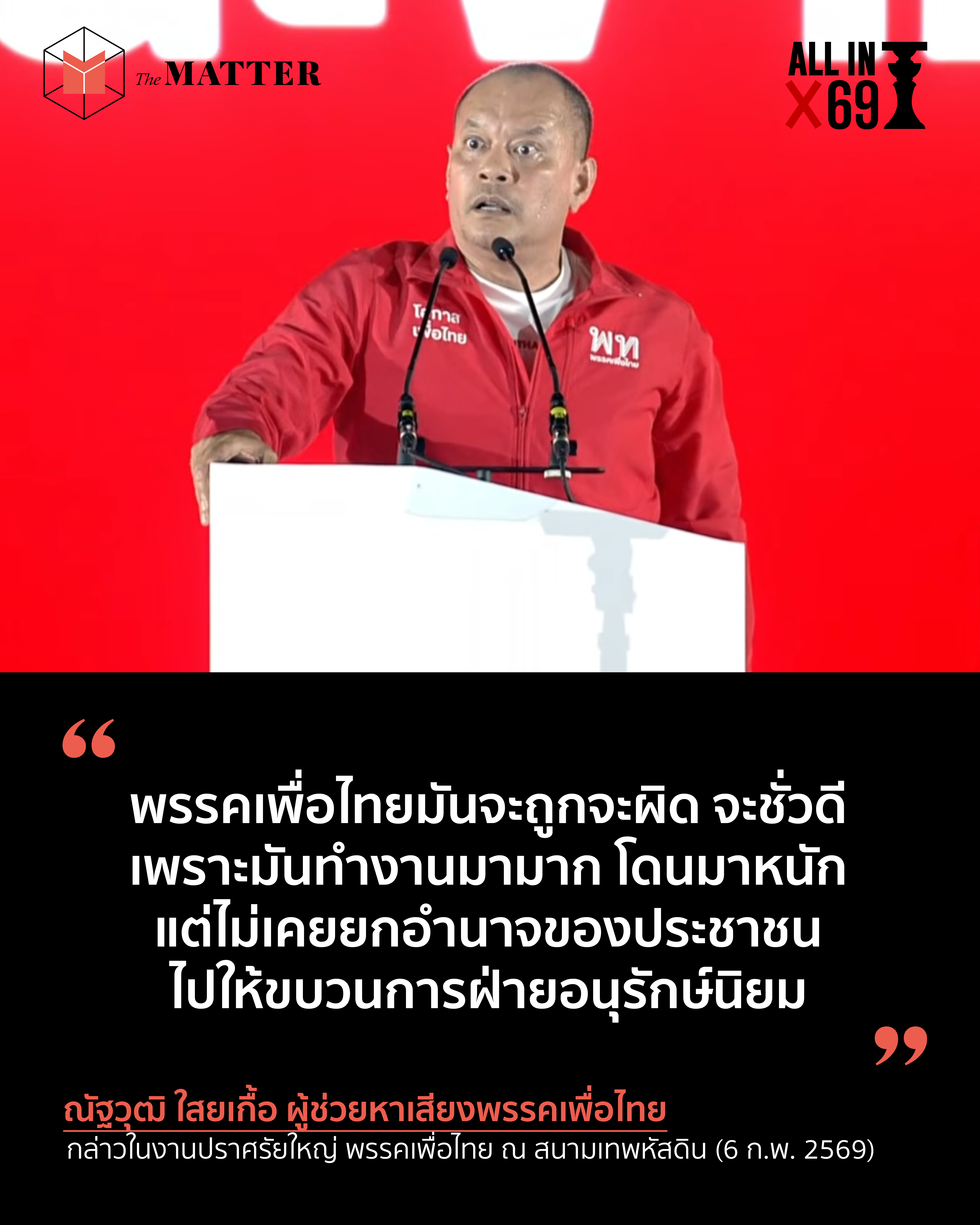 “พรรคเพื่อไทยมันจะถูกจะผิด จะชั่วดี เพราะมันทำงานมามาก โดนมาหนัก แต่ไม่เคยยกอำนาจของประชาชน ไปให้ขบวนการฝ่ายอนุรักษ์นิยม” ณัฐวุฒิ กล่าว