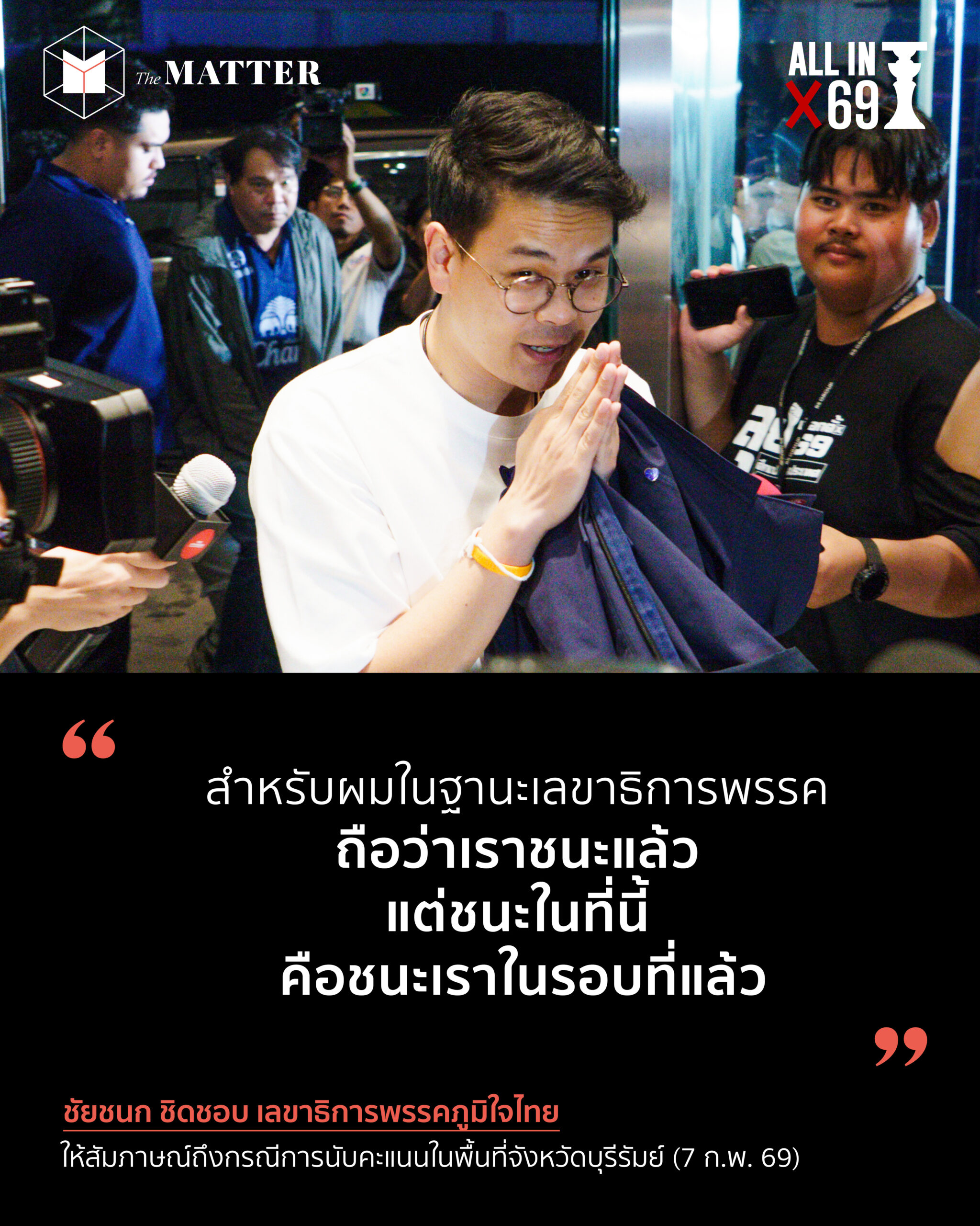 วันนี้ (8 กุมภาพันธ์) ที่ทำการพรรคภูมิใจไทย ชัยชนก ชิดชอบ เลขาธิการพรรคภูมิใจไทย เดินทางเข้ามาที่พรรคโดยเปิดเผยกับสื่อมวลชนถึงผลการเลือกตั้งในพื้นที่จังหวัดบุรีรัมย์ว่า “สำหรับผมในฐานะเลขาธิการพรรค ถือว่าเราชนะแล้ว แต่ชนะในที่นี้ คือชนะเราในรอบที่แล้ว”
